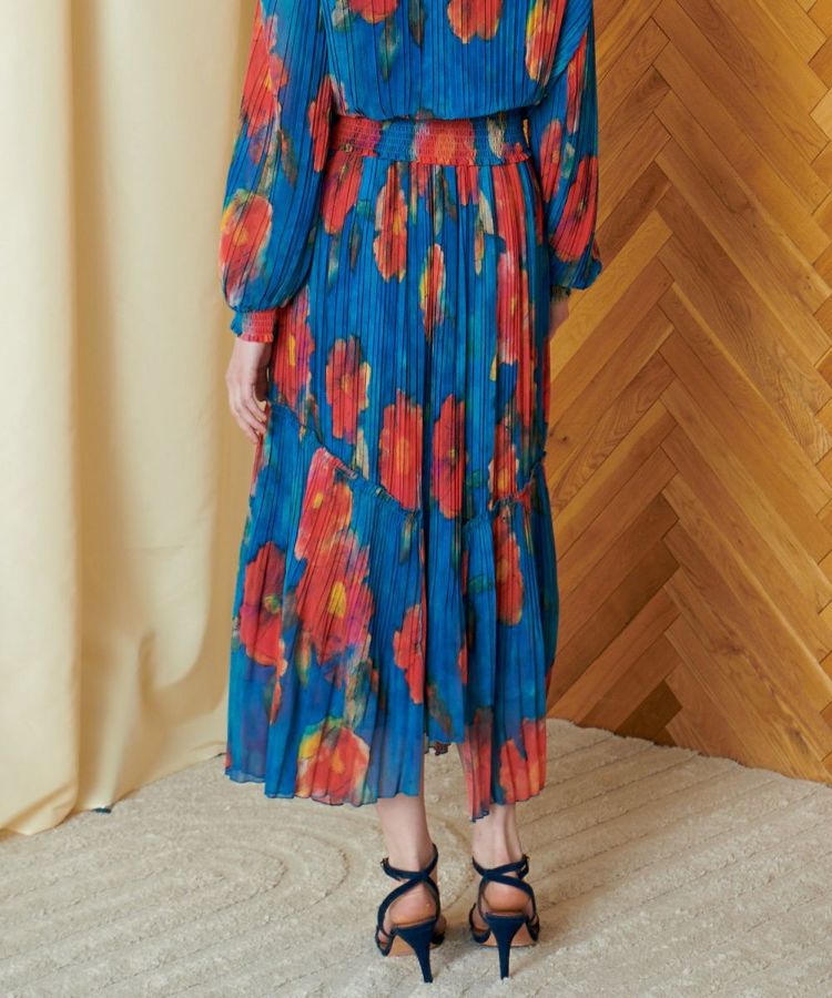鮮やかなカラーリングが目を惹くスカート。全体に細やかなプリーツを施しているため縦のラインが強調され、華やかでありながらもスッキリと見せてくれるのが魅力です。ウエストはゴム仕様なので穿き心地は楽チン。切り替えを施しランダムに仕上げたスカートの裾は、歩くたびに揺れてシルエットがきれいです。