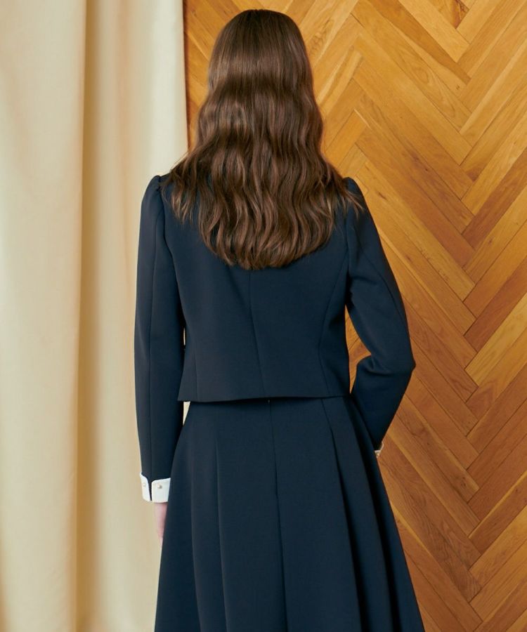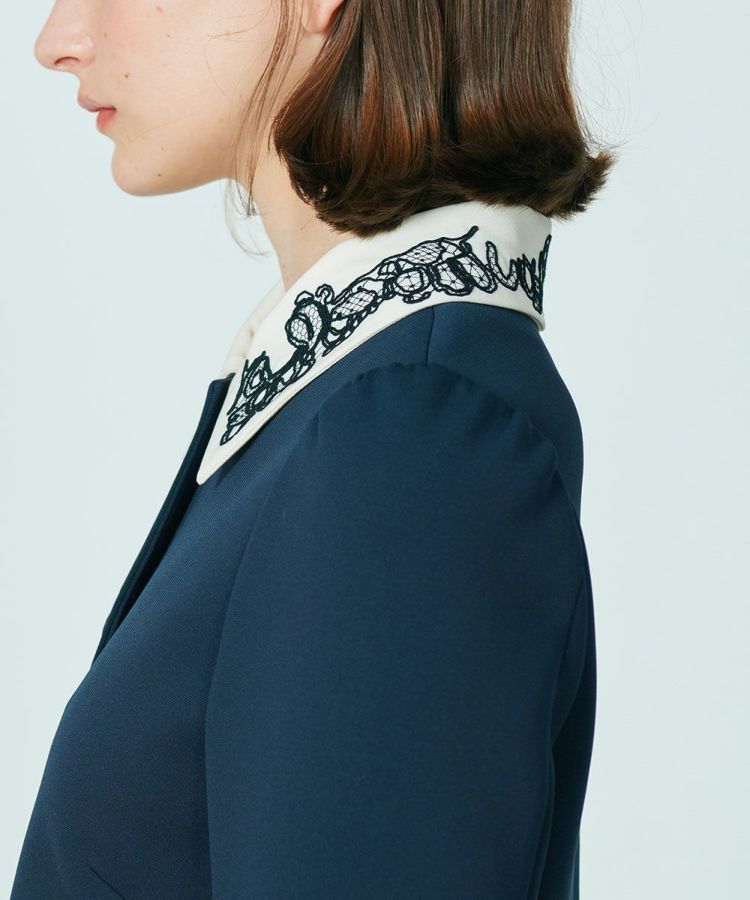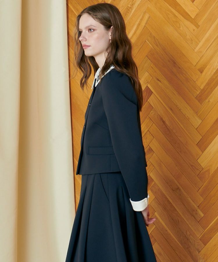なめらかな表面感が美しいジャケット。刺繍入り襟や袖口のパールなど、上品でクラシカルな雰囲気に仕上げました。コンパクトなフォルムなので、全身のコーディネートバランスを取りやすいのもポイント。襟は取り外してノーカラージャケットとしても使えるため、オケージョンから普段のお出かけまでさまざまなシーンで楽しめます。