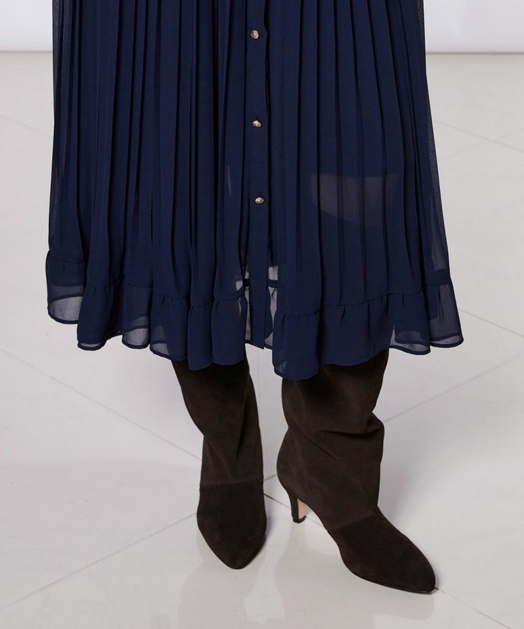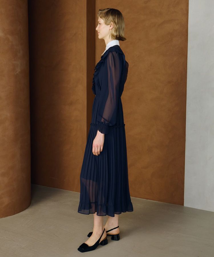 クラシカルなムードをまとった、プリーツデザインのシャツワンピース。程よい透け感のあるポリエステルシフォン素材を採用し、女性らしいヘルシーな肌見せを叶えてくれます。ネイビーに白襟を効かせたバイカラーデザインが、全体を引き締めるアクセントに。胸元と袖まわりにはたっぷりとフリルをあしらい、華やかさと上品さを兼ね備えた一着に仕上げました。