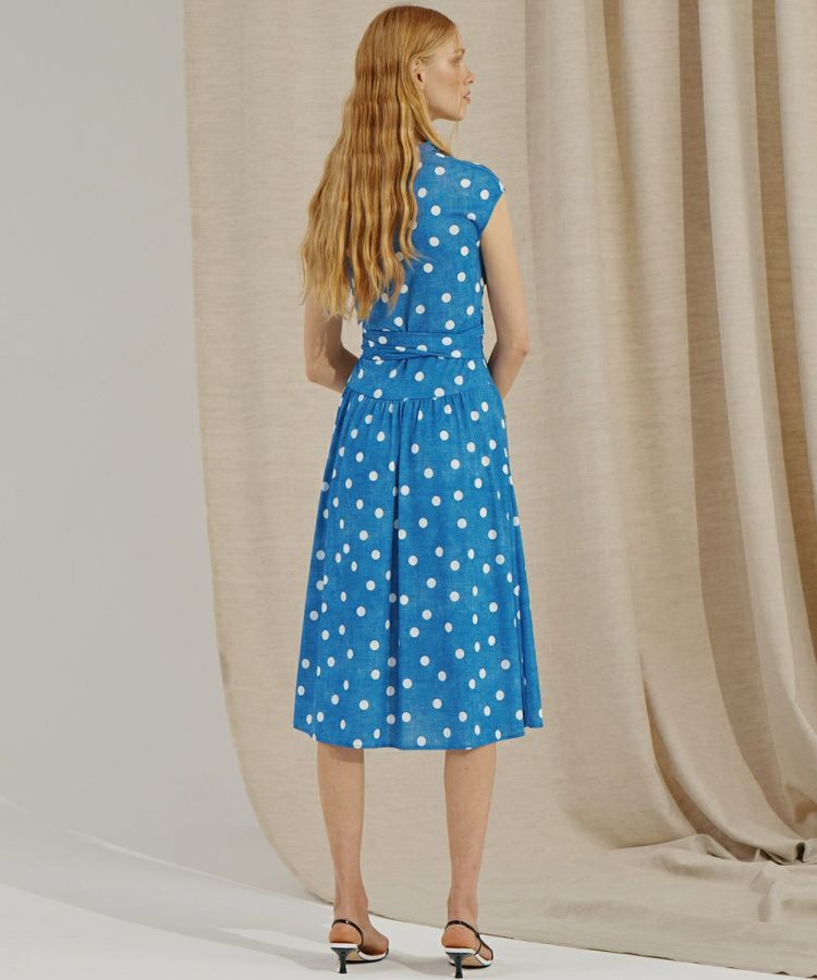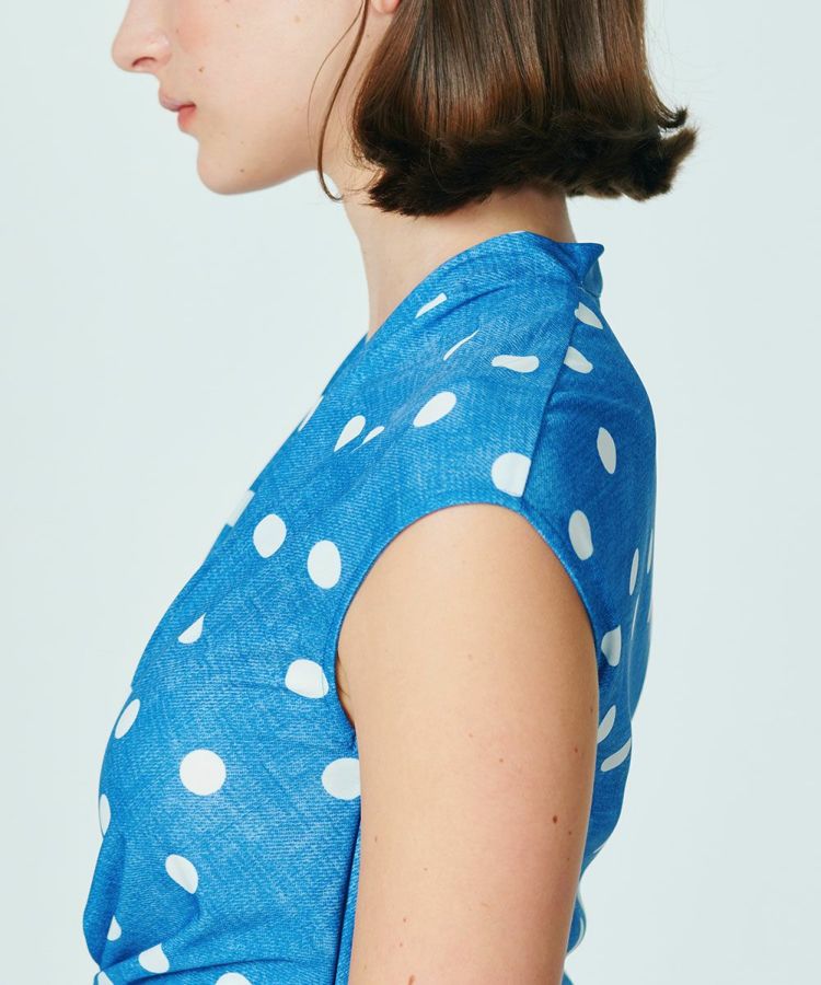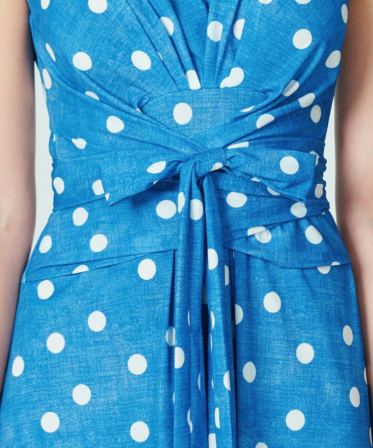 さらりとした着心地が良いジャージー素材に、デニム調のマテリアルプリントをあしらったワンピース。着物のように打ち合わせた胸元が印象的なカシュクールデザイン。ウエストをしっかりと引き締めたことで、メリハリのついた美しいシルエットに仕上げました。爽やかな印象の鮮やかなブルーと、レトロなムードが漂うドットの2種類で展開。これひとつで、大人かわいいを演出してくれます。