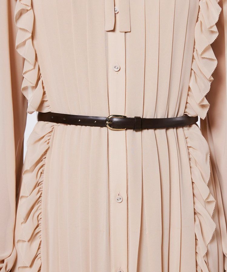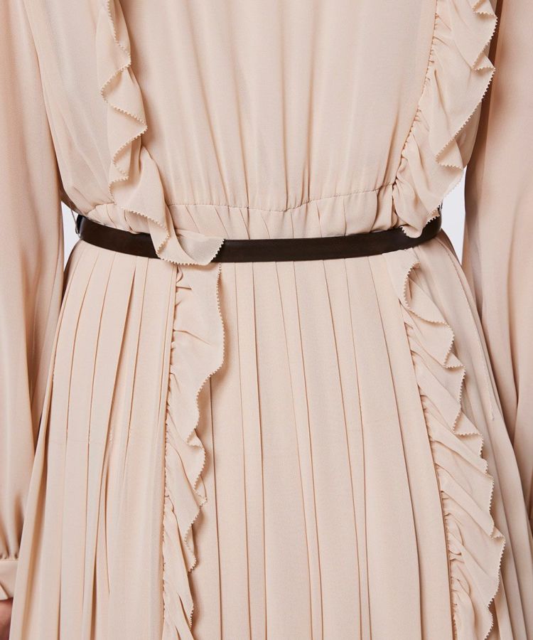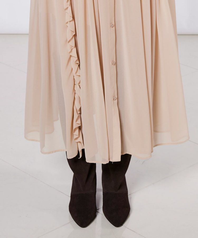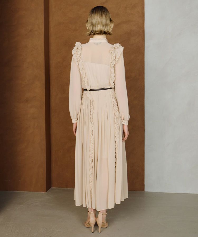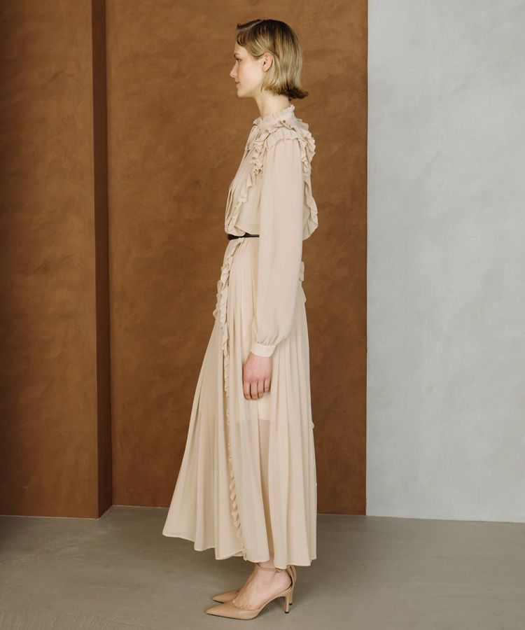 ふんわりと柔らかなシフォン素材を使用したワンピース。程よい透け感がヘルシーな肌見せを叶え、軽やかで女性らしい印象を演出します。トップから裾まであしらわれたフリルとプリーツが縦ラインを強調し、スタイルアップ効果を実現。クラシカルな雰囲気が漂う一着は、シーンを問わず幅広く活躍します。