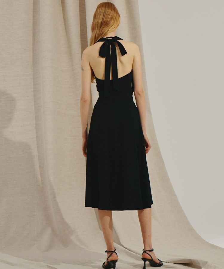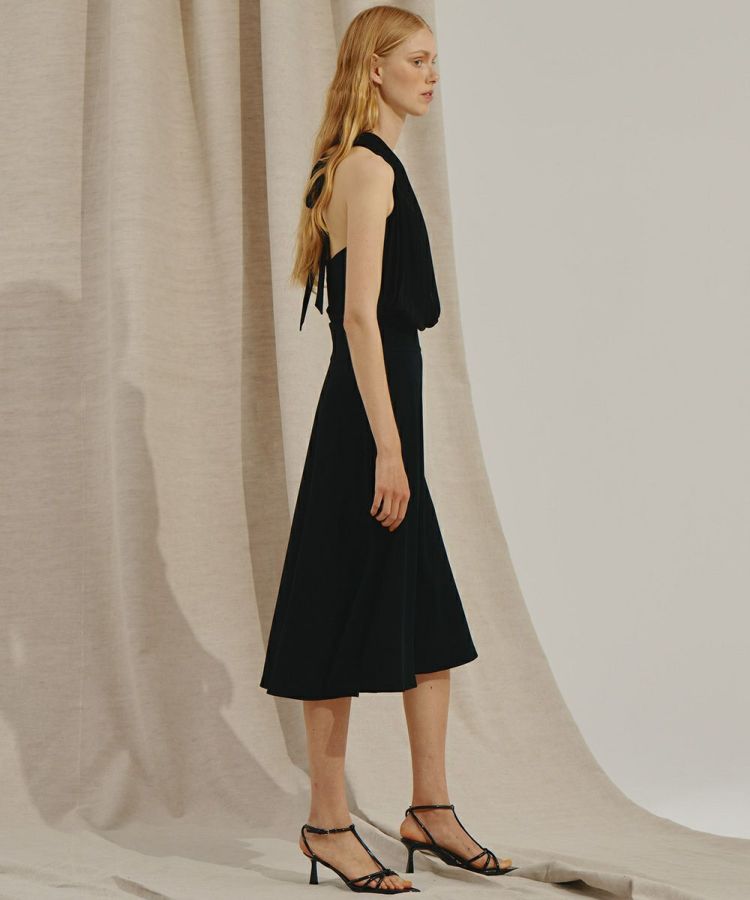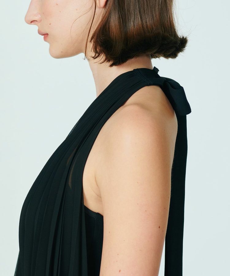 シフォン素材とサテンジョーゼットで仕上げたレディライクなワンピース。胸元のカシュクールタックの美しいラインに、たっぷりのプリーツでボリュームを持たせて、メリハリのあるシルエットにしました。ざっくりと開いた背中に大ぶりのリボンをつけることで、程よいかわいらしさを演出。センシュアルなムードを残したオールブラックドレスは、パーティーシーンにも活躍すること間違いなしです。