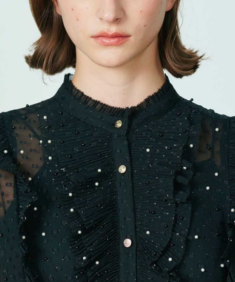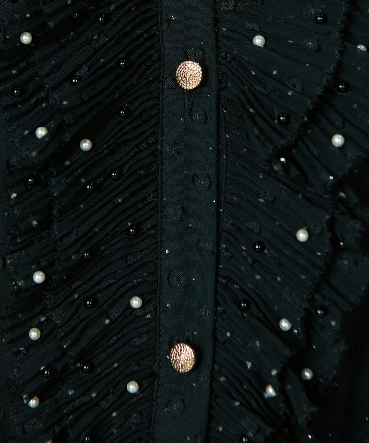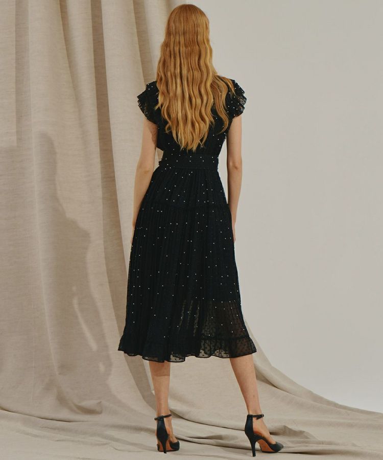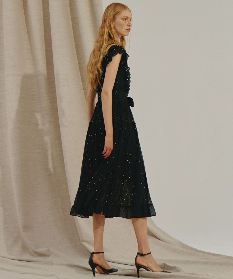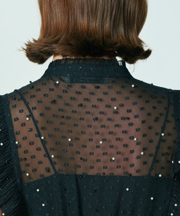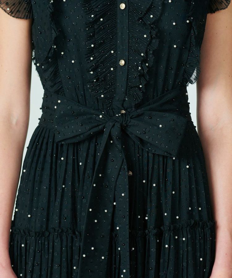 シフォン素材の柔らかい風合いが魅力的なワンピース。黒と白のビーズを贅沢に散りばめて、さりげない煌めきをアクセントに忍ばせました。袖口のフリルとウエストのリボンが大人のかわいさを演出。透け感のある生地がほのかな色気を添えつつ、フェミニンさもプラスしました。さらに、胸元にはたっぷりとギャザーを入れて、華やかな印象に仕上げています。
