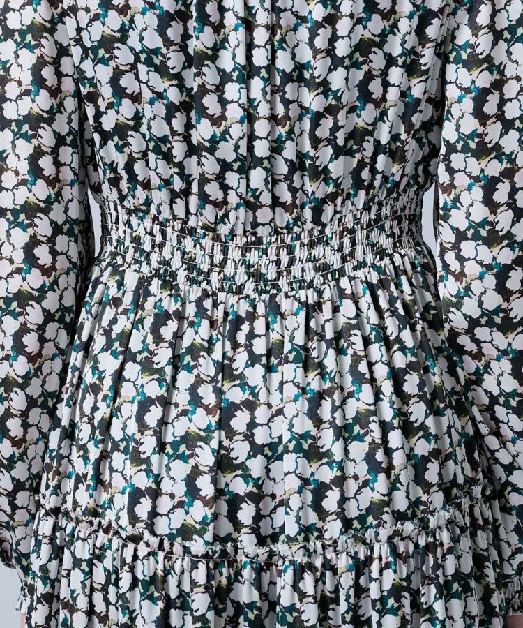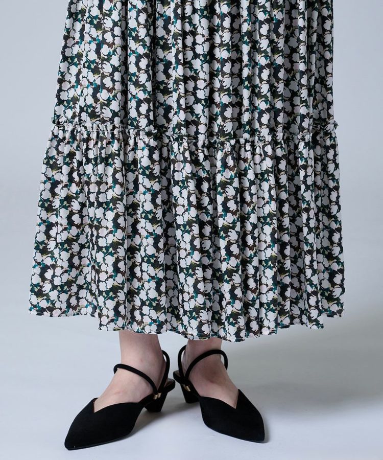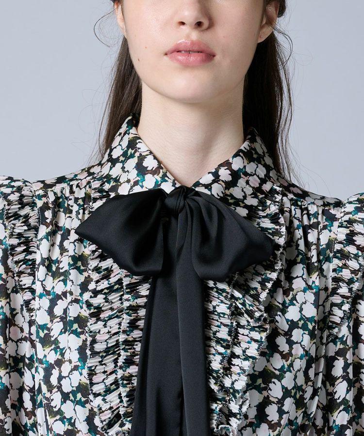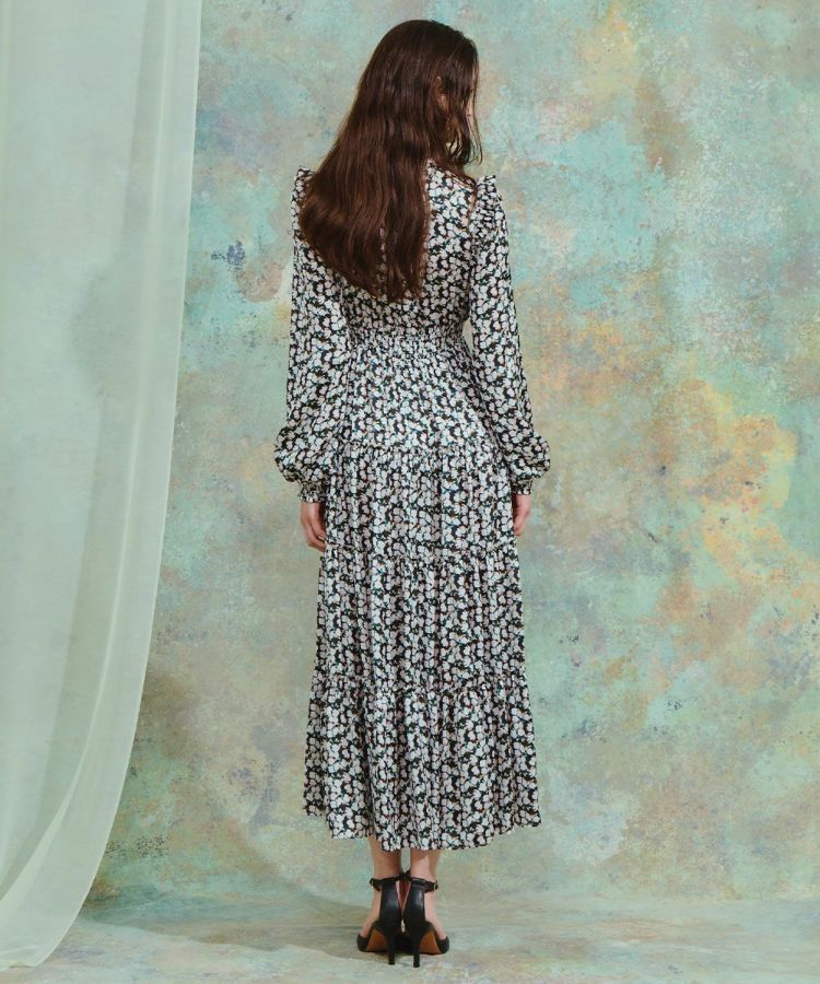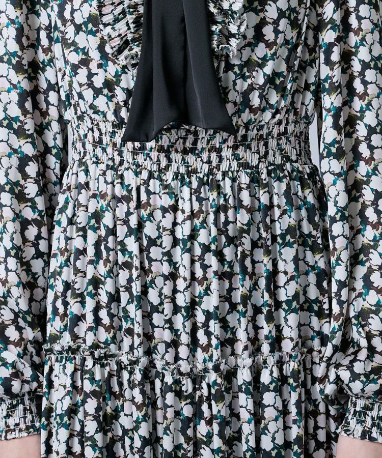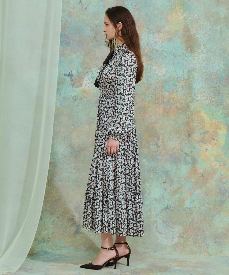 大ぶりのブラックリボンがクラシカルな印象を与えるワンピース。胸元のフリルとティアードデザインのスカートが、ロマンティックで華やかなムードを演出します。程よい光沢感のあるサテン生地を使用し、上品で高級感のある仕上がりに。襟付きのデザインがきちんと感をプラスし、特別なシーンにも映える一枚です。