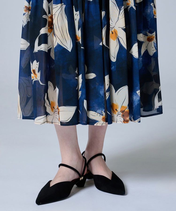 ネイビー×ホワイトのコントラストと、大ぶりの花柄が印象的なワンピース。ウエストにシャーリングを施し、ティアード調のスカートが女性らしさを演出します。程よい透け感のあるシフォン素材が、軽やかで柔らかな雰囲気をプラス。幅広いシーンで活躍する一枚です。