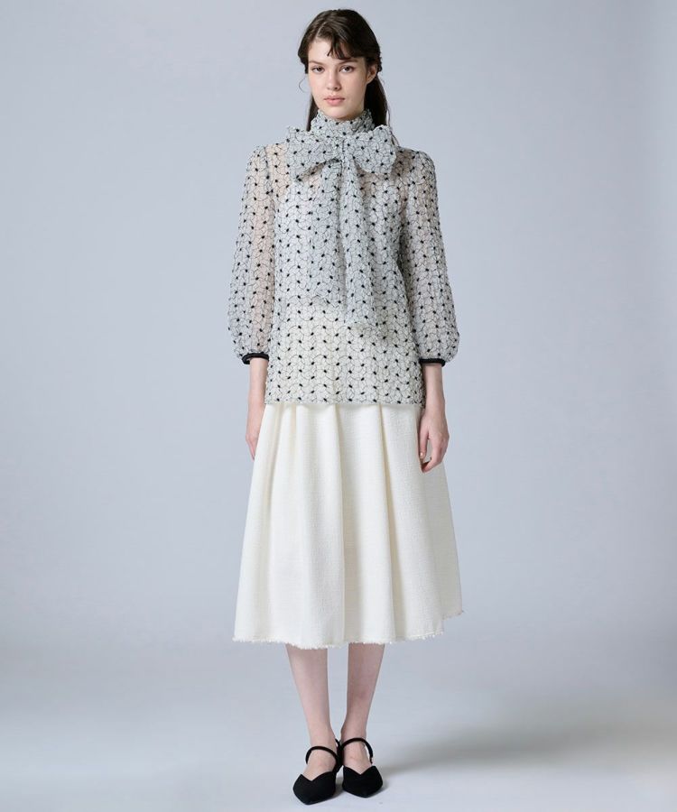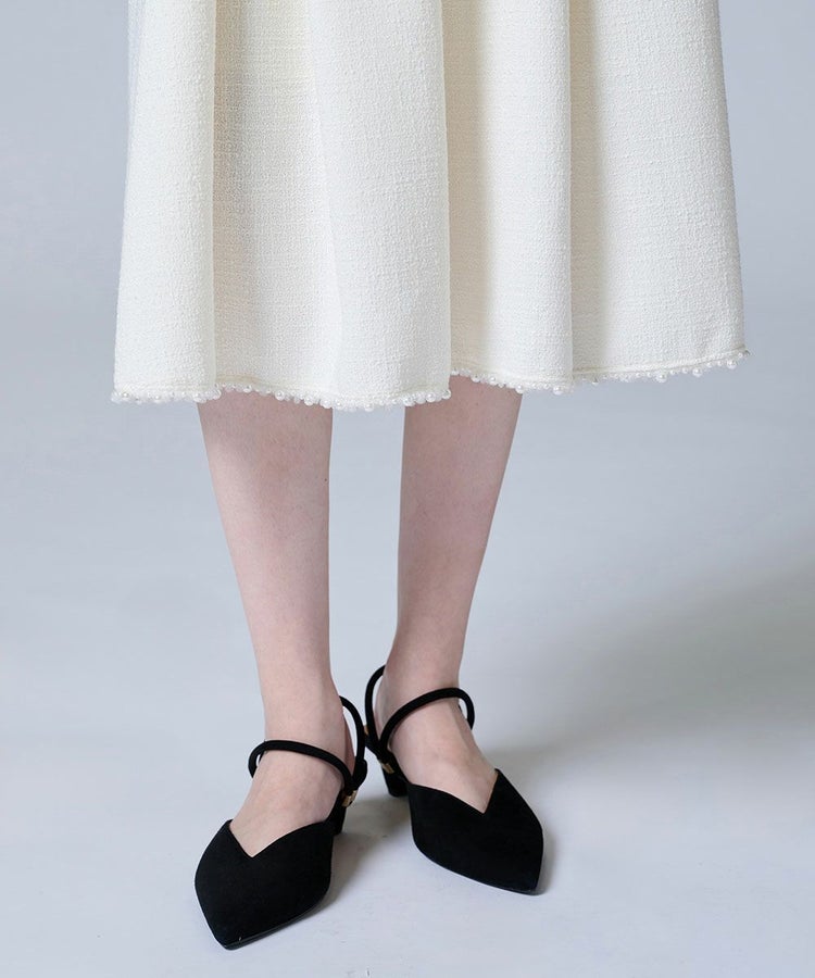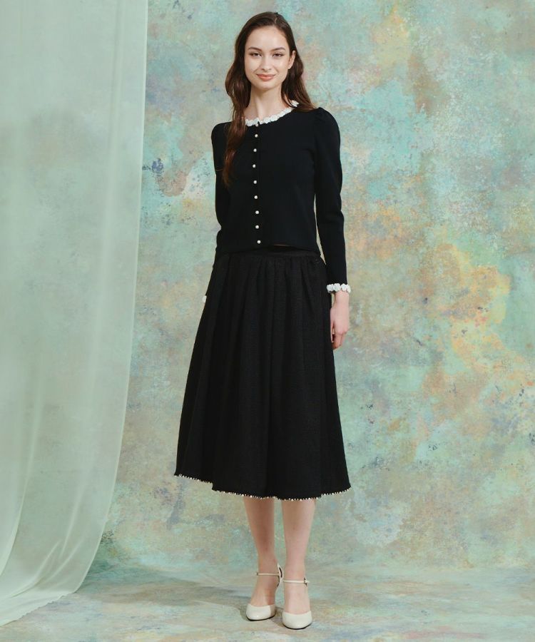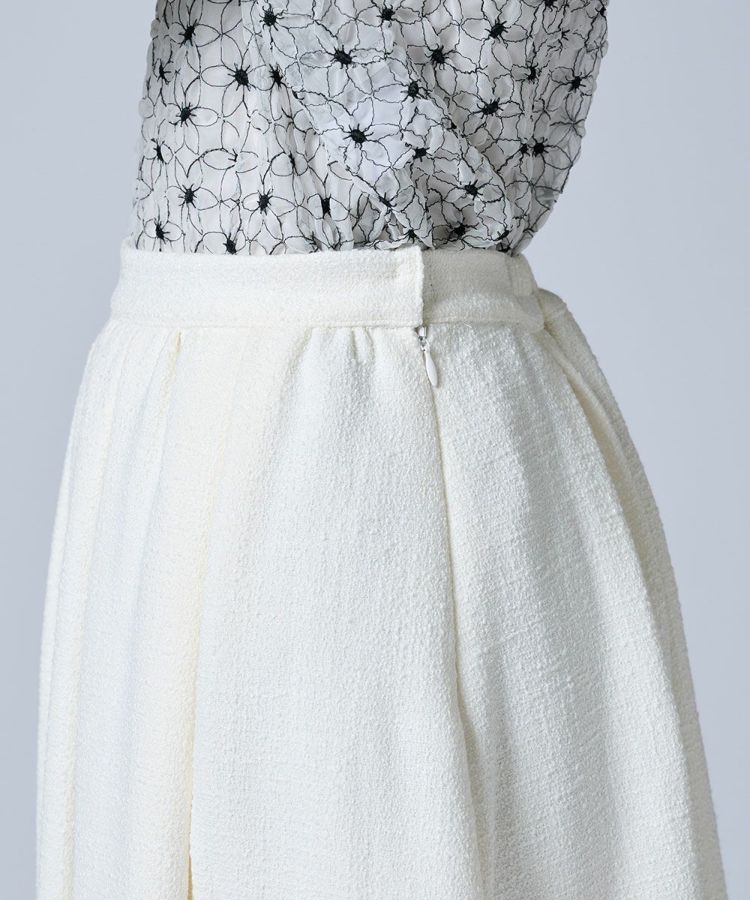 表情豊かなツイード素材を使用したスカート。程よいフレアシルエットが動くたびに美しく揺れ、エレガントな雰囲気を引き立てます。裾にはパールをあしらい、上品な華やかさをプラス。同素材のジャケット(型番:3805030261)と合わせれば、洗練されたセットアップスタイルが完成します。