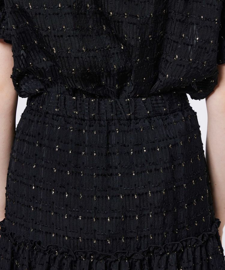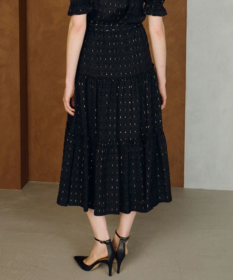 エレガントな雰囲気をまとったティアードスカート。ゴールドのラメを織り込んだジャカード素材を使用し、さりげない煌めきが上品な華やかさを演出します。足元はパンプスと合わせるとレディライクな印象に。同素材のブラウス(型番:3804060253)とセットで着用すれば、ワンピース風のスタイルも楽しめる一着です。