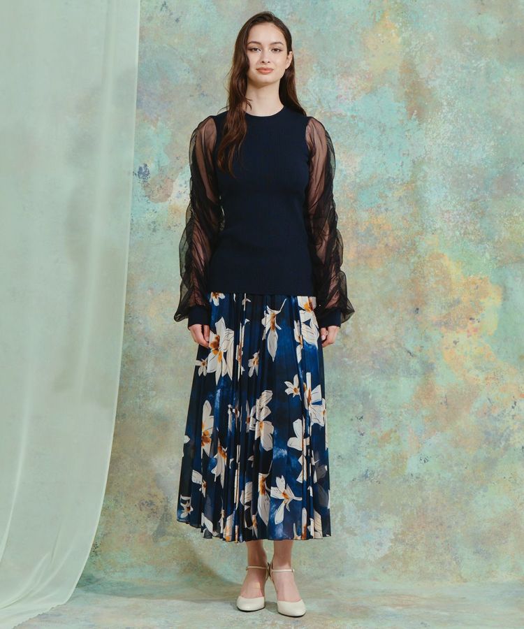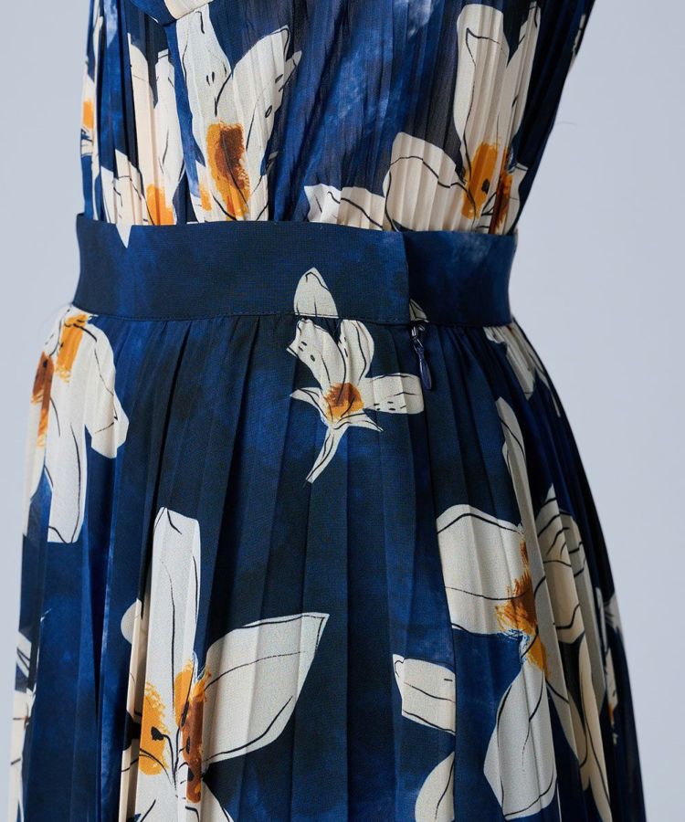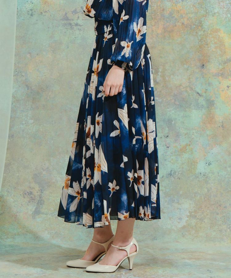ネイビーとホワイトのコントラストが美しいフラワープリントをあしらったロングスカート。プリーツ加工を施すことで縦のラインを強調し、華やかさの中にもすっきりとした印象を与えます。軽やかなシフォン素材が程よい透け感を生み、上品でエレガントな雰囲気に。同素材のブラウス(型番:3804181261)と合わせれば、統一感のあるワンピース風スタイルが完成します。