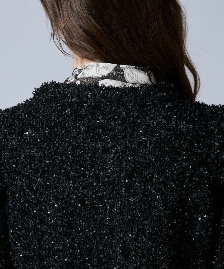 全面に煌びやかなスパンコールを贅沢に散りばめた、華やかなカーディガン。ノーカラーデザインで首元をすっきりと見せつつ、大ぶりのボタンが上品なアクセントを添えます。やや短めの丈感で、スカートやパンツなどどんなボトムスとも好バランスにスタイリングできるのも嬉しいポイント。羽織るだけでコーディネートを華やかに格上げし、オン・オフ問わず活躍する万能な一枚です。