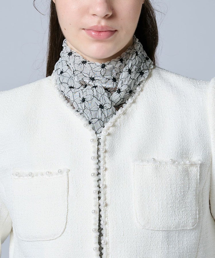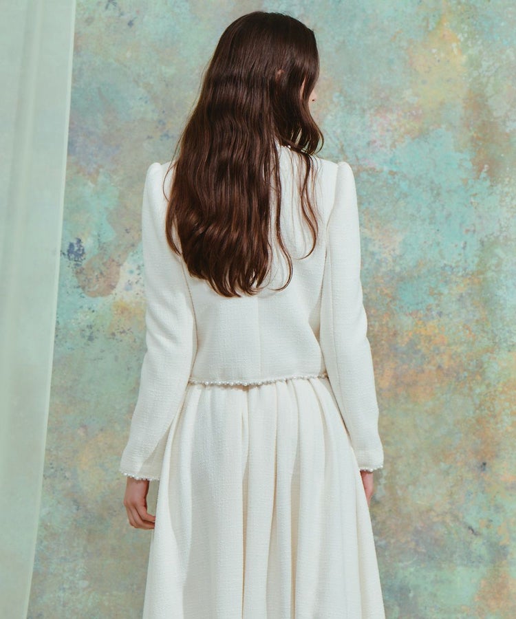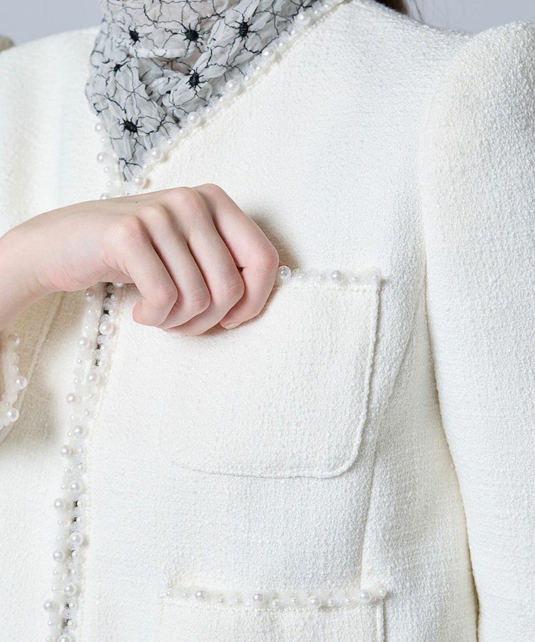 どんなシーンにもマッチするツイードジャケット。裾や袖口にあしらったパールビーズが上品な華やかさを添えました。ノーカラーデザインで顔まわりをすっきりと見せ、抜け感のある印象に。デニムと合わせたカジュアルダウンスタイルはもちろん、オケージョンシーンにも映える万能な一着です。
