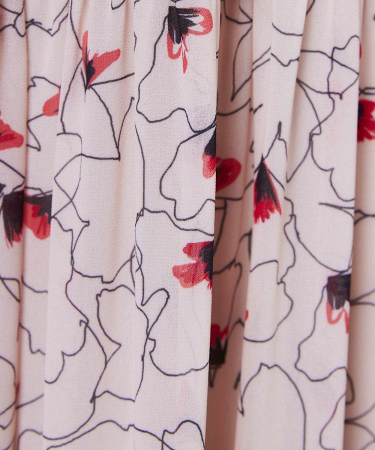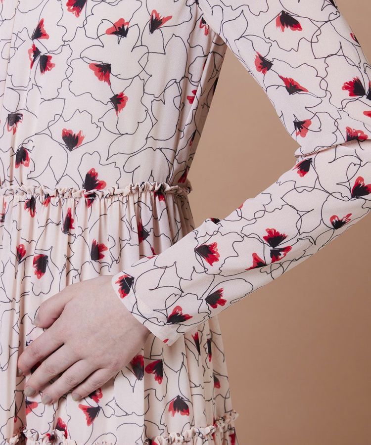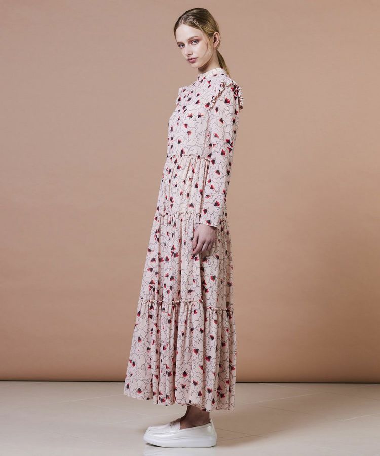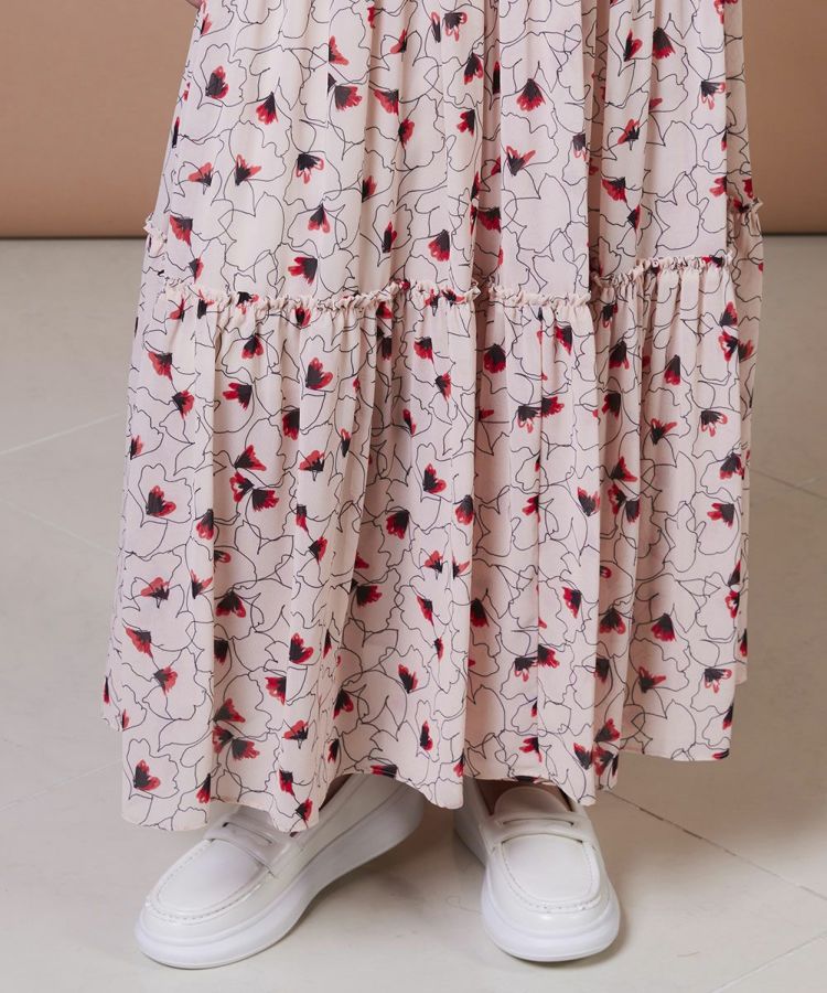華やかな花柄を全面にあしらったロングワンピース。ドライタッチのシフォン素材を使用し、軽やかな着心地で季節を問わず活躍します。落ち感が美しいティアードデザインで、大人かわいい雰囲気を演出。1枚でスタイリングが決まる主役級アイテムは、この夏のワードローブに取り入れたい一着です。