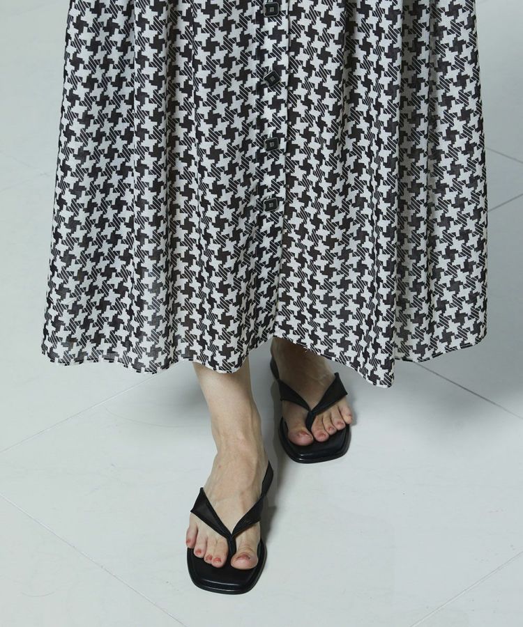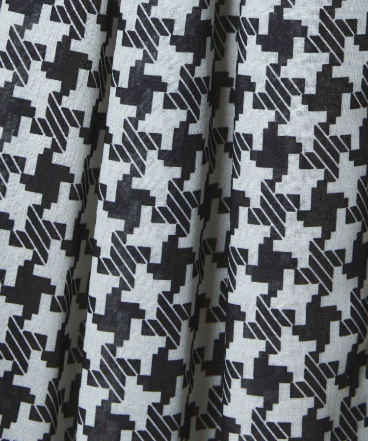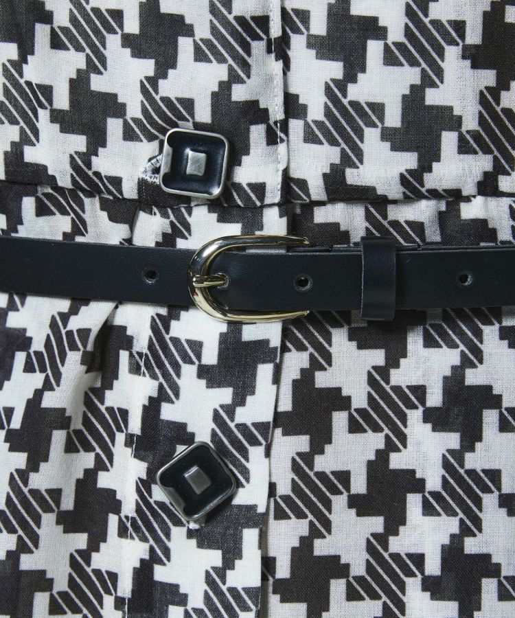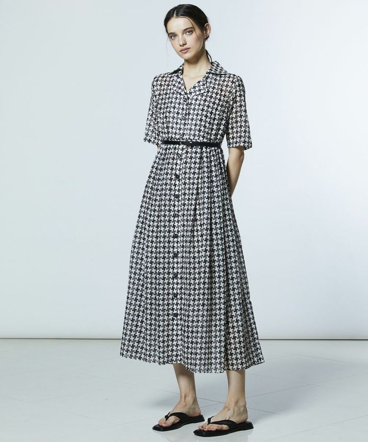 オープンカラーがレトロな雰囲気を漂わせるワンピース。モノトーンの幾何学柄を全面にあしらい、クールで洗練された印象に仕上げました。ウエストには細めのベルトを添え、自然なメリハリのあるシルエットを演出。柔らかなシフォン素材の程よい透け感が軽やかさをプラスし、1枚でスタイリングが完成する万能なアイテムです。