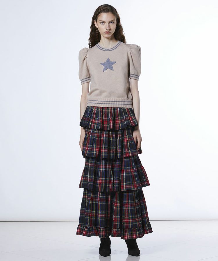 ボリュームたっぷりのフリルが目を惹く、華やかなロングスカート。全面にタータンチェック柄をあしらい、ブリティッシュテイストに仕上げました。ウエストはゴム仕様で快適な履き心地を実現。存在感のあるデザインなので、シンプルなトップスを合わせるだけでコーディネートが完成する主役級アイテムです。