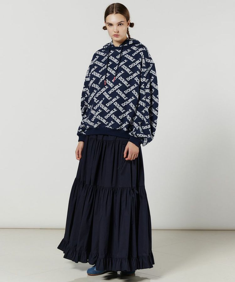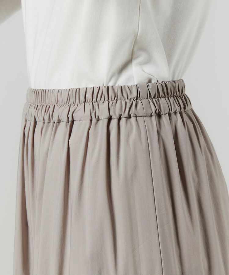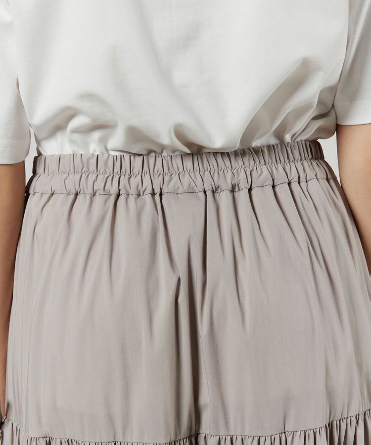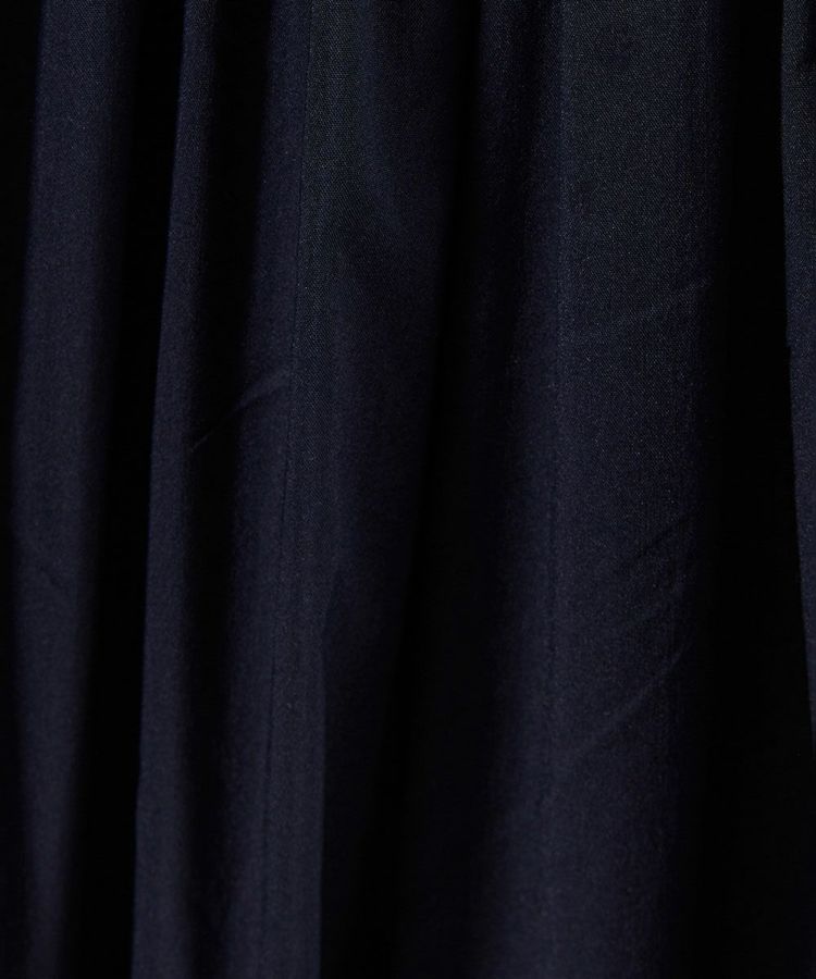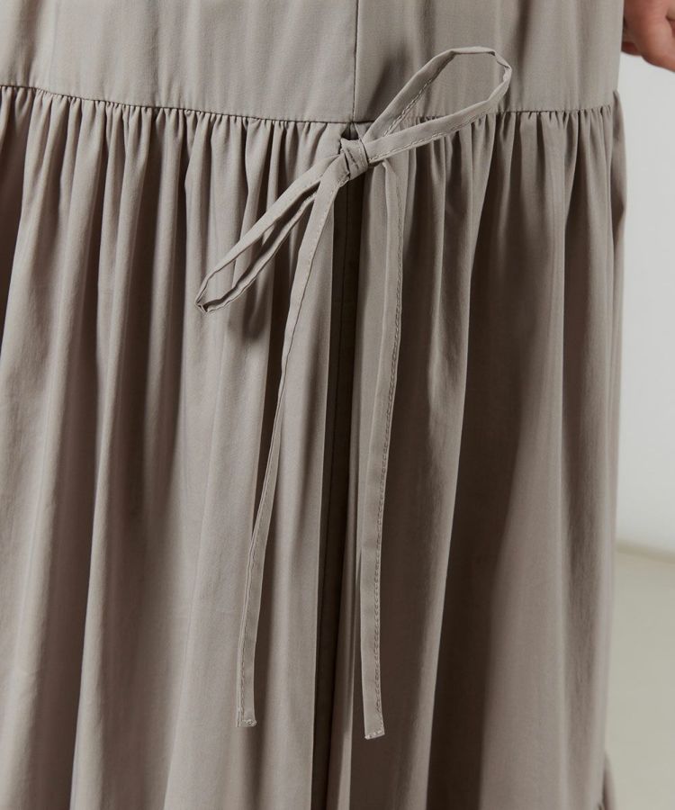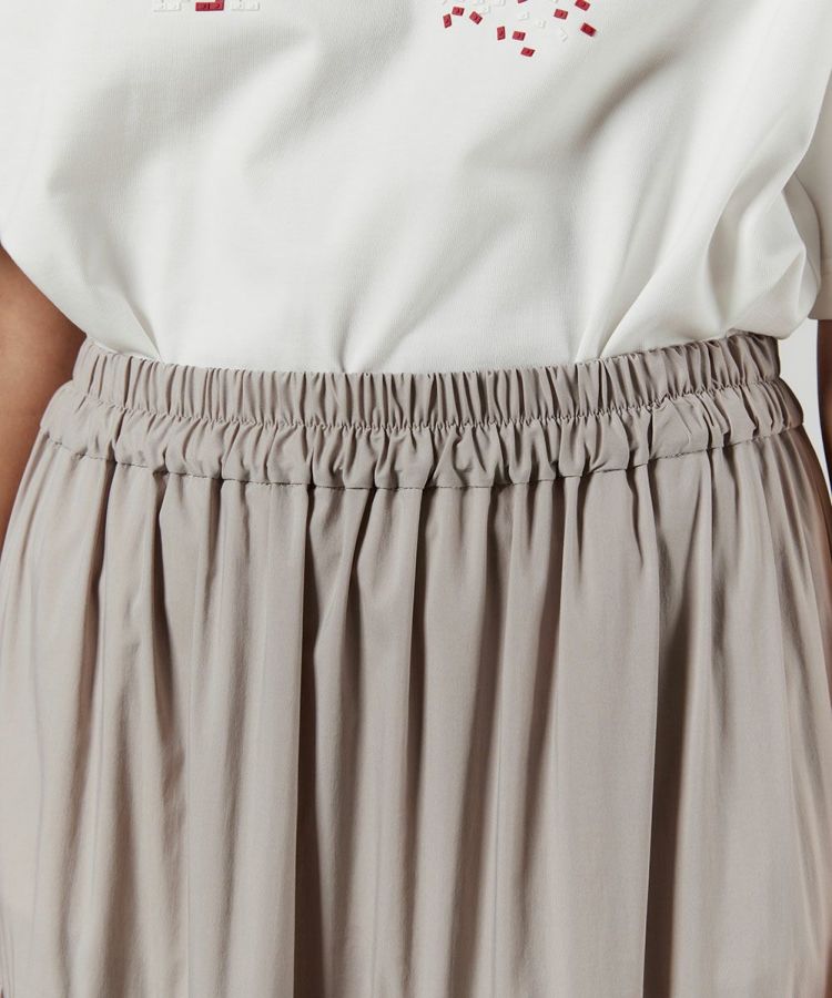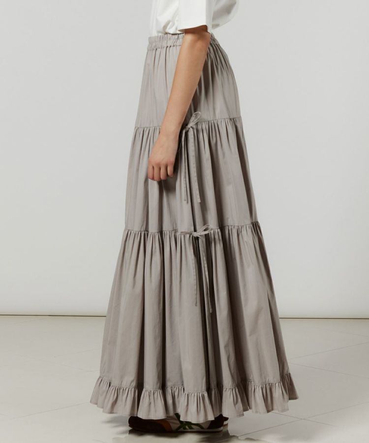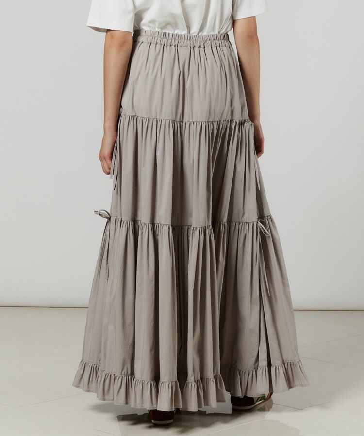 着まわし力に優れたベーシックなカラーリングながら、ギャザーをたっぷりと寄せ優雅な印象に仕上げたスカート。足元までのスーパーロング丈、歩くたびに揺れる裾のフリル仕上げもフェミニンなポイントです。また、切り替え部分にはさりげなくリボンディテールをプラス。お手持ちのTシャツやスウェットに合わせるだけで大人かわいいコーデが完成する優れものです。ウエストはゴム仕様で穿き心地は楽チン!