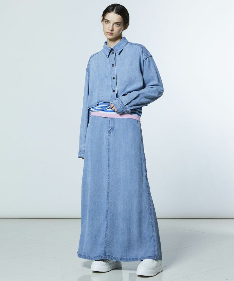 なめらかで上品な光沢を持つテンセルデニム素材を使用したシャツ。カジュアルながらも、きれいめな着こなしを叶える一枚です。クロップド丈のシルエットは、さりげない肌見せを演出しつつ、インナー次第でさまざまなスタイリングが楽しめるのもポイント。同素材のロングスカート(型番:0204230261)と合わせると、ワンピース風にも着こなせます。