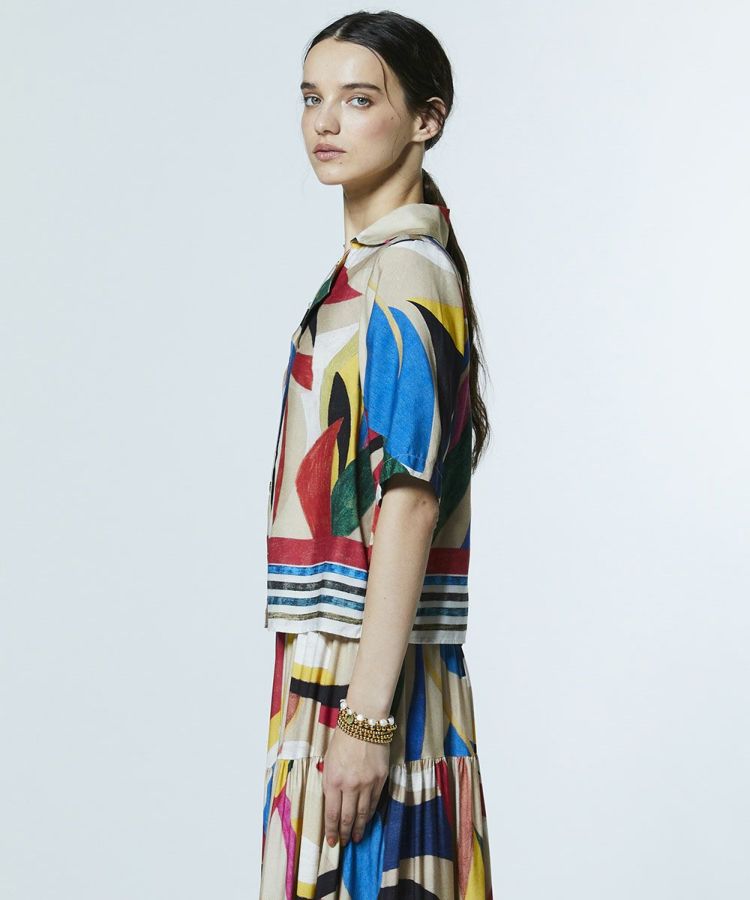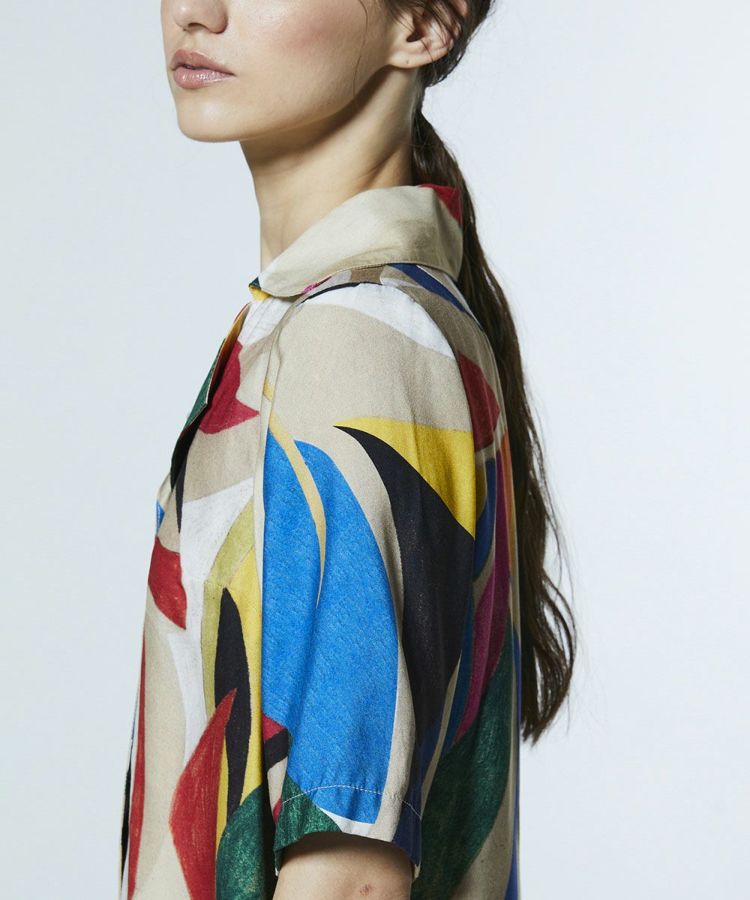 存在感のあるカラフルな柄が目を惹くシャツ。とろみのある美しい落ち感とドレープ性、しなやかな肌触りと上品な光沢を併せ持つレーヨン素材を使用し、エレガントな雰囲気に仕上げました。オープンカラー仕様で自然なこなれ感を演出。同素材のスカート(型番:0202491261)と合わせれば、個性が際立つワンピース風のスタイリングが楽しめます。