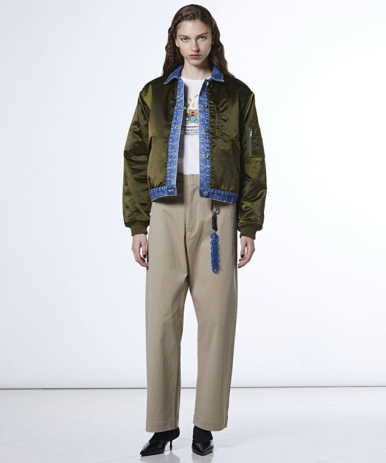 異素材の組み合わせがスタイリッシュなMA-1ジャケット。グロッシーな光沢と程よい厚みが特徴的なナイロン素材を採用し、軽やかで快適な着心地を実現しました。デニム部分にはブリーチバイオ加工を施し、ヴィンテージライクな風合いをプラス。羽織るだけでコーデが決まる存在感のある一着は、カジュアルにもガーリーにもマッチする万能アウターです。