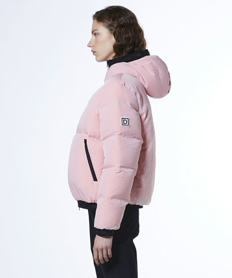 軽やかなシアー感が柔らかな印象を与えるナイロン素材のダウンジャケット。胸元にはダブスタロゴをあしらい、さりげないアクセントをプラスしました。カラーはフェミニンなオレンジと、上品で大人っぽいパープルの2色展開。同素材のレッグウォーマー(型番:0200241254)とのセットコーディネートで、カラーをリンクさせたスタイリングを楽しめます。