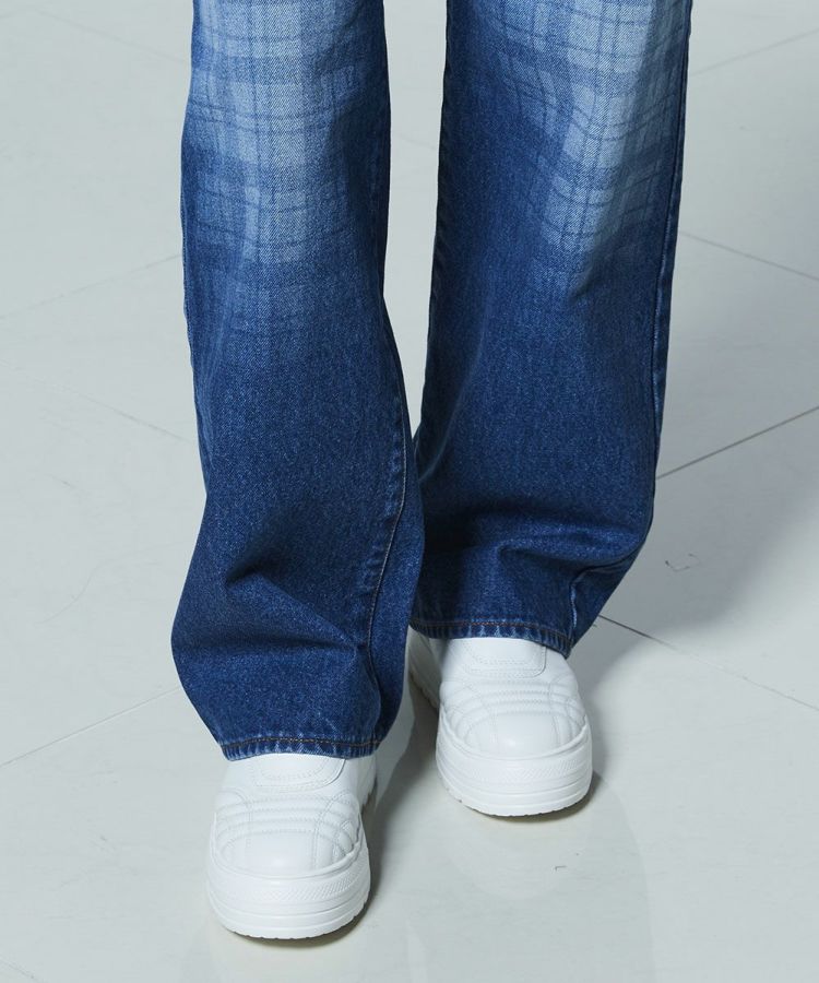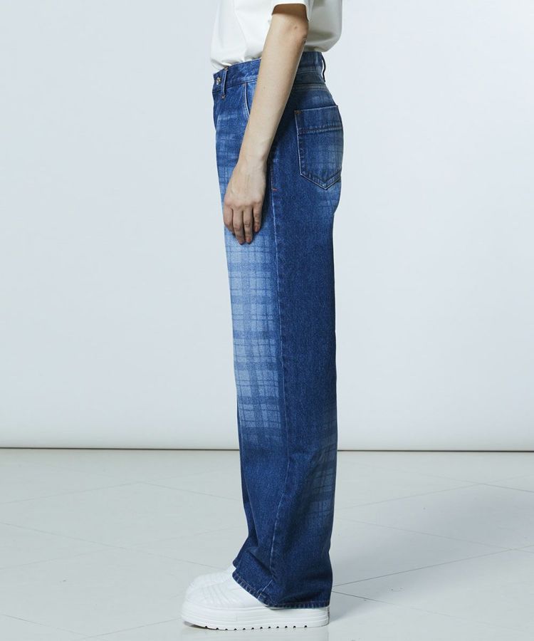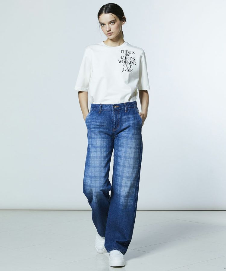 弱テンションで織り上げた生地が、ヴィンテージライクな表情を引き立てるデニムパンツ。独特なムラ感にさりげないチェック柄を重ね、個性の光るデザインアクセントをプラスしました。縦のラインをきれいに見せるストレートシルエットで、すっきりとした印象に。ひと味違うデニムは、同素材のジャケット(型番:0205350261)と合わせることで、存在感のあるセットアップスタイルが完成します。