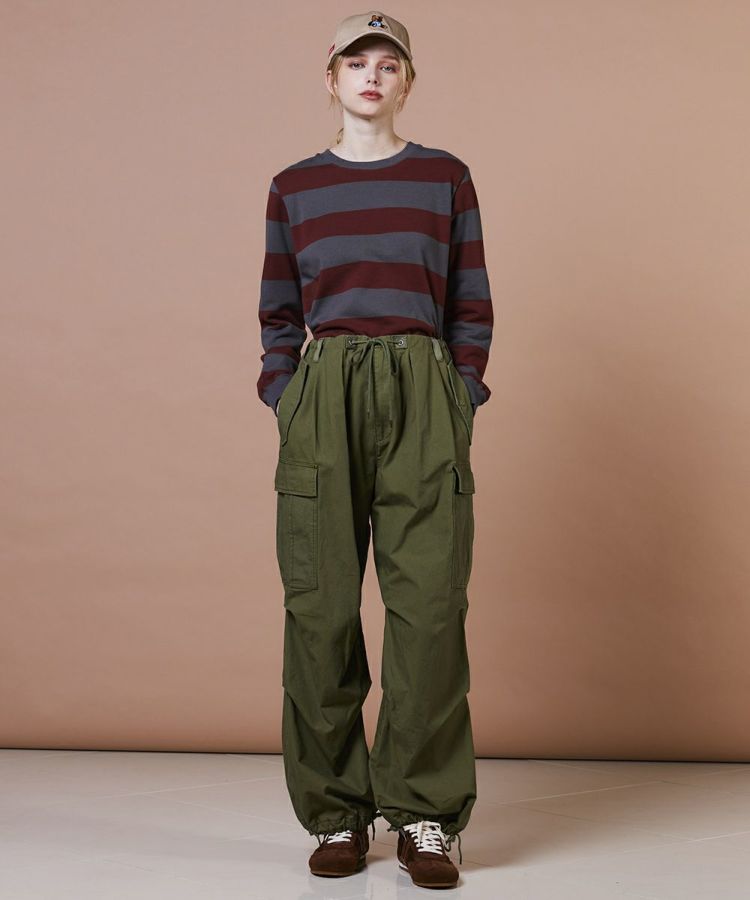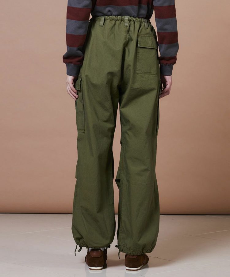 ハリ感のある素材に、染色加工でヴィンテージライクな風合いを加えたミリタリーパンツ。使い込む内にデニムのようなタテ落ち感が生まれ、経年変化も楽しめる一本です。ウエストや裾部分は絞ってシルエットの調整が可能。同素材のジャケット(型番:0204320253)と合わせれば、本格的なミリタリースタイルが完成します。