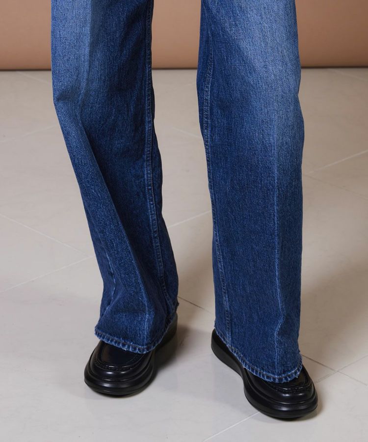 レーザー加工でセンターラインを施し、美しいシルエットに仕上げたデニムパンツ。セルビッチ風の凹凸感と、弱テンションで織り上げた生地が、ヴィンテージライクな表情を引き立てます。腰まわりはすっきりと仕上げ、身体のラインを拾いにくい点も高ポイント。シーズンレスで着回せるため、ワードローブに加えておきたい万能アイテムです。