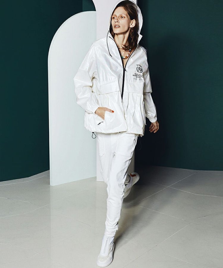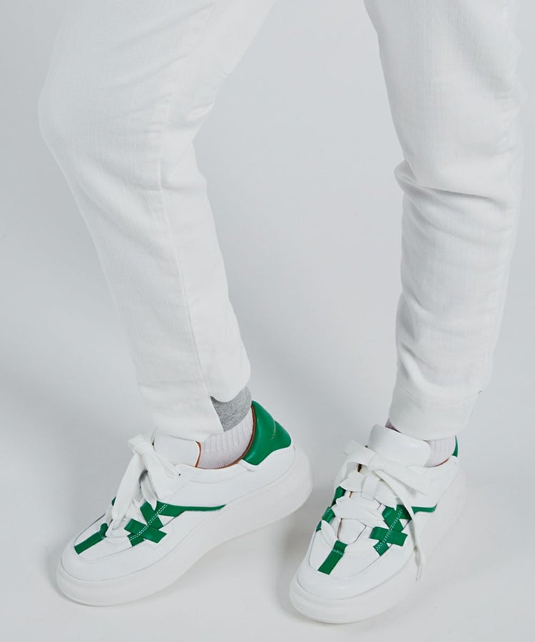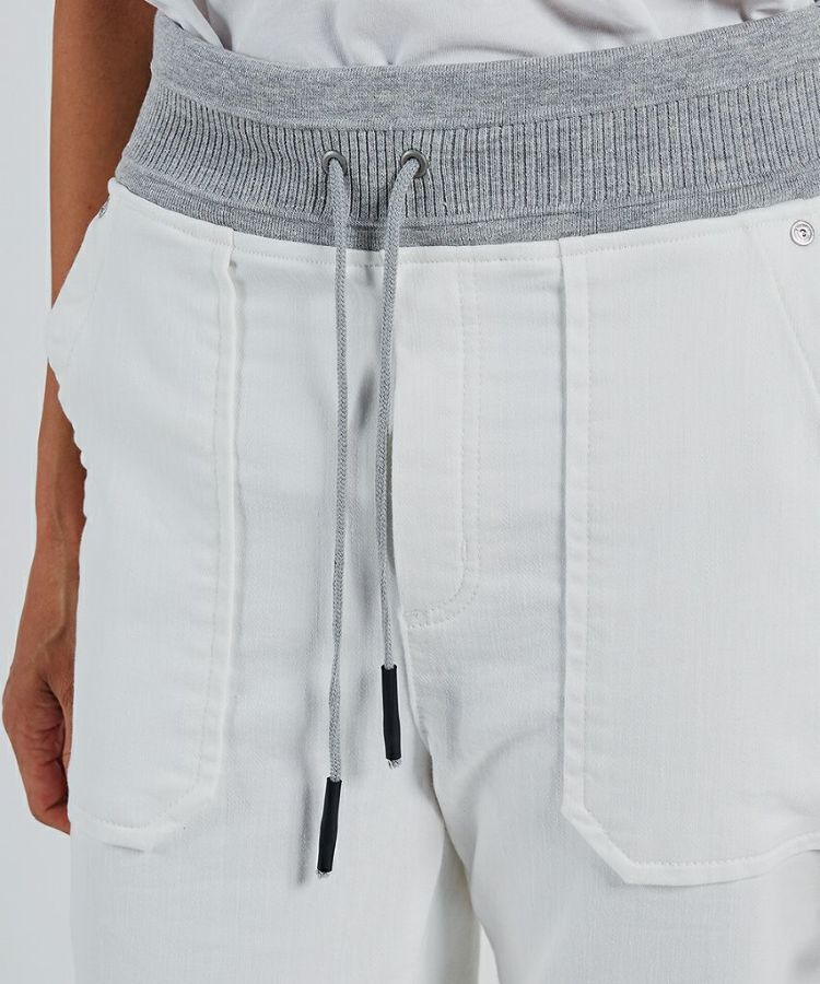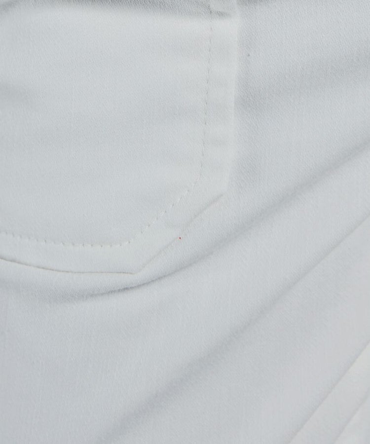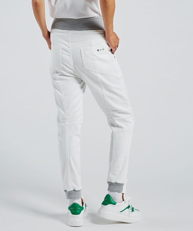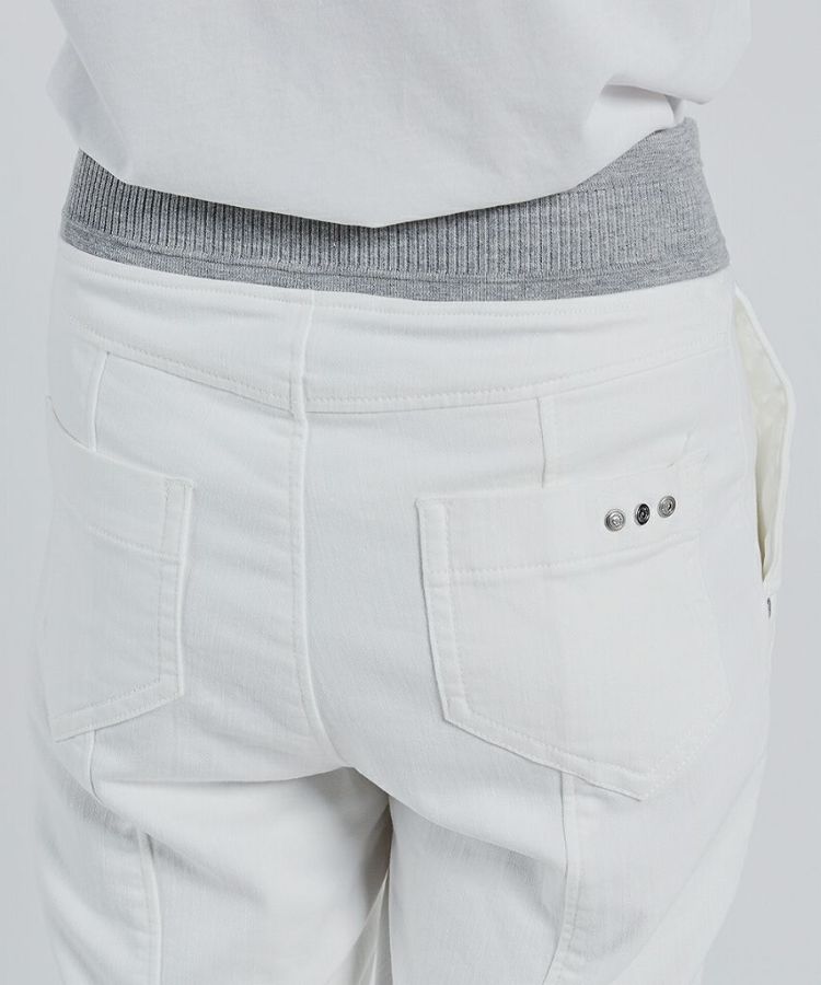 今季イチオシの、スポーツMIXスタイルにこなれ感を出してくれるホワイトデニムパンツ。ニットなのでストレッチ性があり楽チンで、素材感はしっかりジーンズながらもレギンス感覚で穿けるのが魅力です。太ももまわりをカバーしてくれる大きめポケットと、バッグの切り替えもポイント。白でも膨張せず美脚見えします。