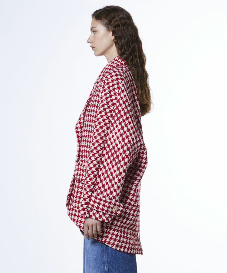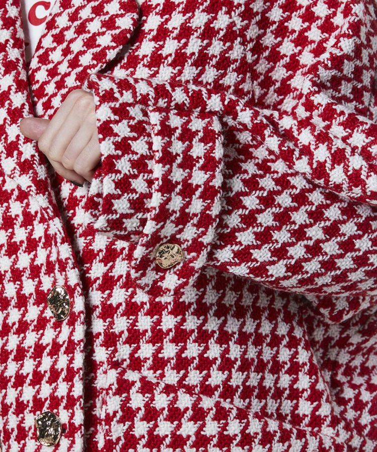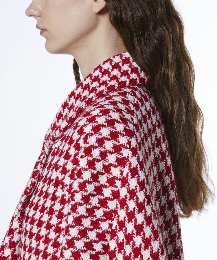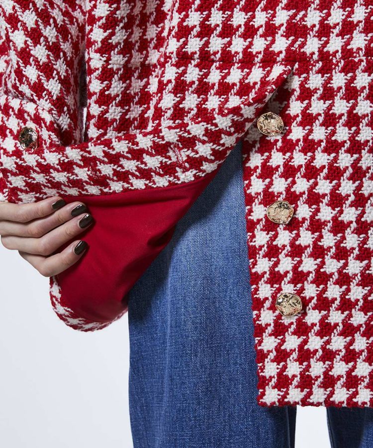 レッド×ホワイトの格子柄チェックが目を惹くコート。ヴィンテージ感のあるツイード生地を使用し、カジュアルになりすぎずクラシカルな雰囲気を演出します。裾は丸みを帯びたラウンドヘムで独特のシルエットを作り、着こなしに個性をプラス。主役級の一着はデニムとも好相性で、遊び心のあるコーディネートも楽しめます。