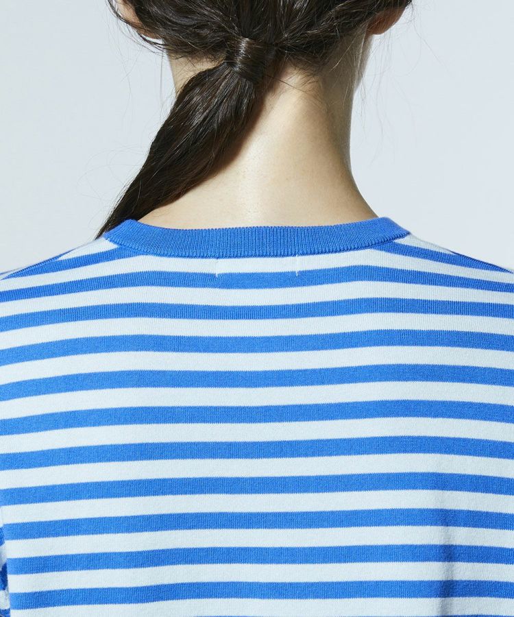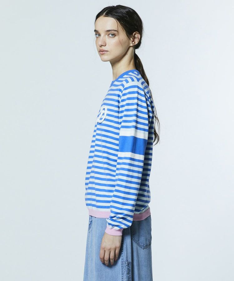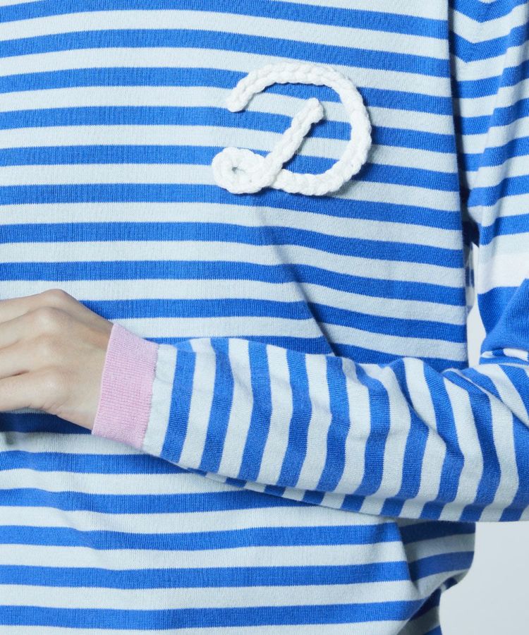 鮮やかなブルーとホワイトのボーダー柄が爽やかな印象を与えるニット。胸元にはブランド頭文字の「D」をローブ刺繍で立体的にあしらい、さりげない存在感をプラスしました。裾に施したピンクのラインが、キュートなアクセントに。デニムと合わせたカジュアルスタイルはもちろん、ロングスカートと合わせたフェミニンな着こなしも楽しめる一枚です。