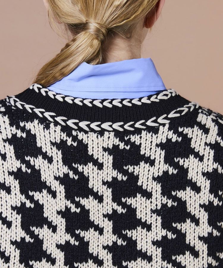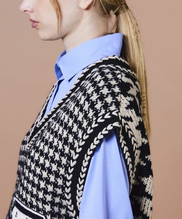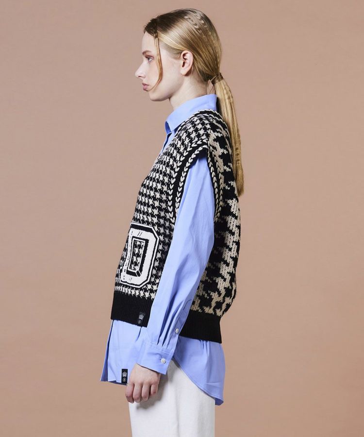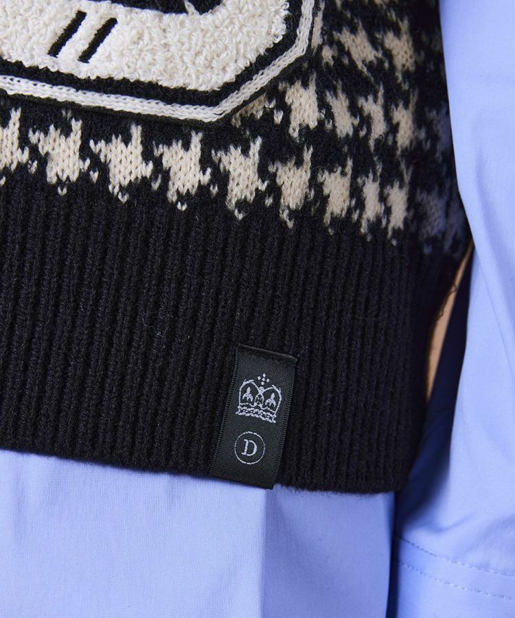 全面にあしらった千鳥柄が目を惹くニットベスト。立体感のあるジャカード素材を使用し、表情豊かに仕上げました。フロントの「D」のビッグワッペンがアクセントを添え、遊び心のあるデザインに。インナー次第でさまざまな雰囲気を楽しめるため、レイヤードスタイルに重宝する秋冬のマストアイテムです。