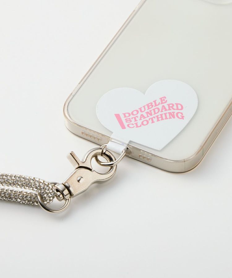 アクセサリー感覚で使えるキラキラ輝くラインストーンの紐が特徴になったスマホ用ショルダーストラップ。ダブスタのロゴをあしらったレッドとホワイトのハート型のホルダーをセットにしました。付け替え可能なデザインなので、その日の気分に合わせてカラーをチェンジ可能。キーホルダーとしても活躍する、機能性とデザイン性を兼ね備えたアイテムです。