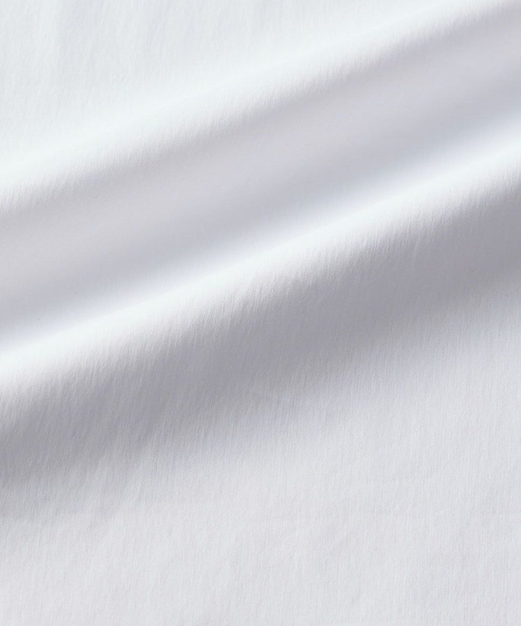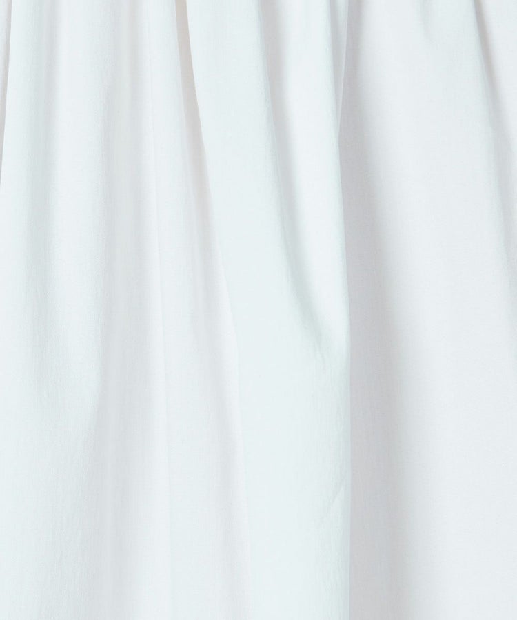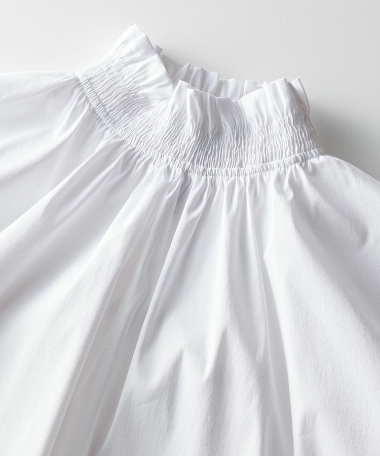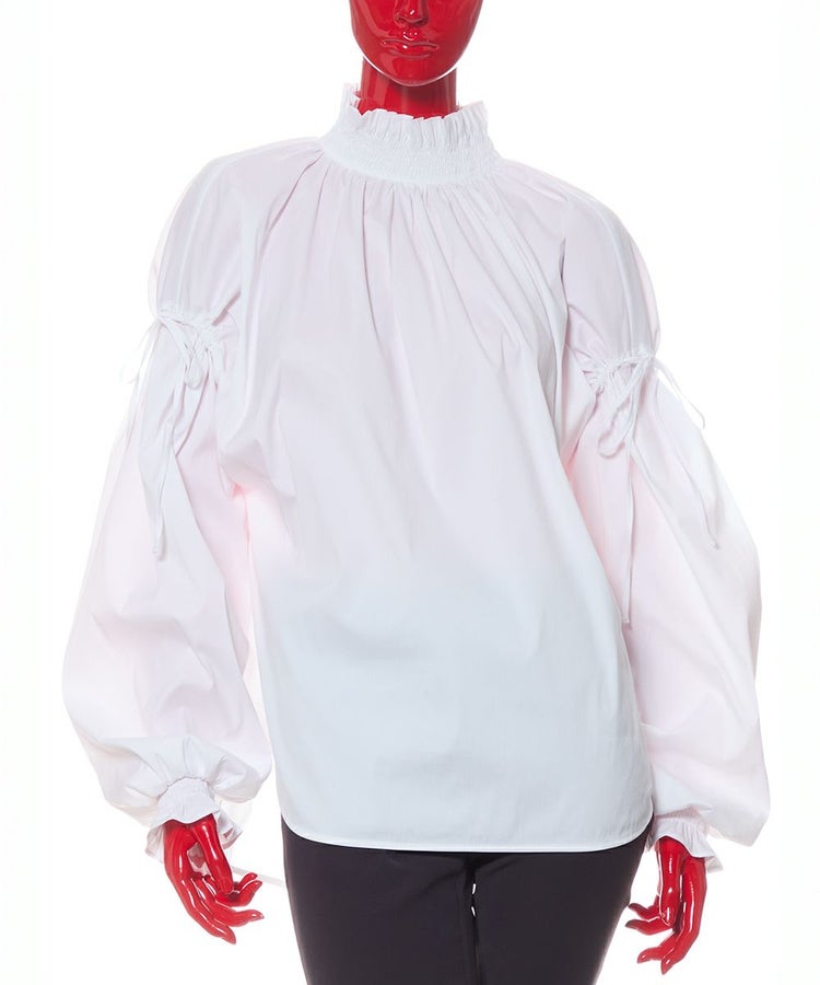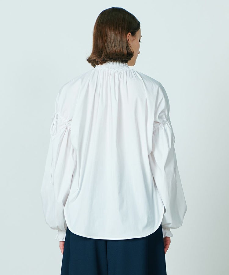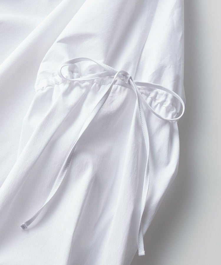 パリッとした質感がかっこいいブラウス。ゆったりとしたシルエットでマニッシュな雰囲気ながら、襟元がフリルになり、ほんのりと華やかさがあります。また、ショルダーは落とし気味に作り、ギャザーを寄せてシルエットにメリハリをプラス。リボンもさりげないフェミニンさを出し、コーディネートした時に全身にモード感が出るのが密かなポイントです。爽やで合わせやすいホワイト。