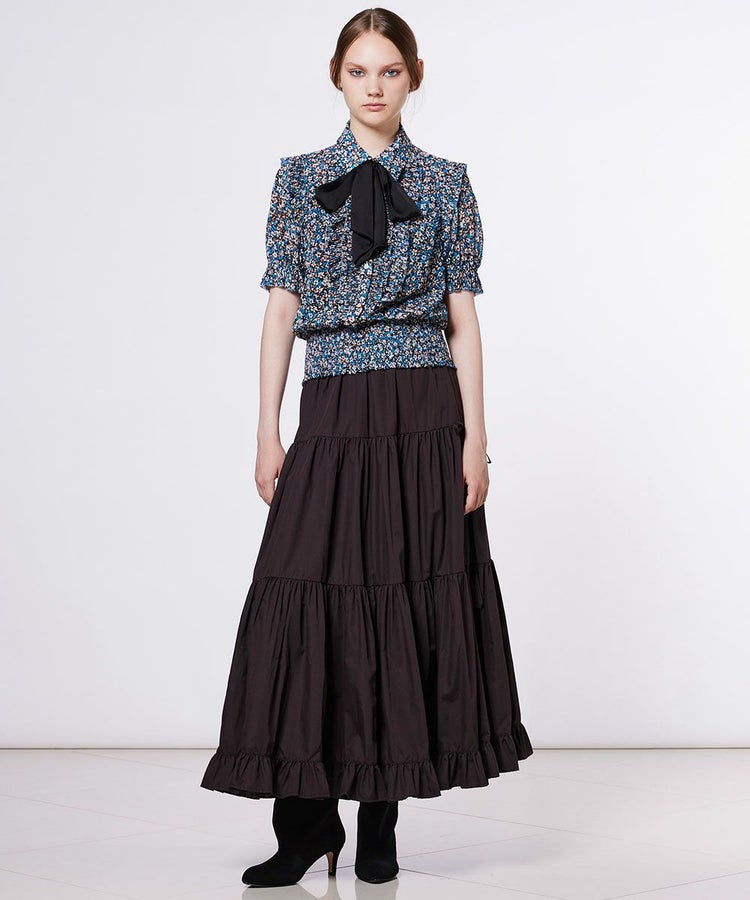 全面にあしらった小花柄と黒のリボンが、クラシカルなムードを演出するシフォンブラウス。軽やかな素材感が、女性らしいやわらかさを引き立てます。胸元と袖口にはたっぷりとギャザーを施し、華やかな表情に。ロングスカートでフェミニンに、シンプルなパンツと合わせて品よく着こなすのもおすすめです。