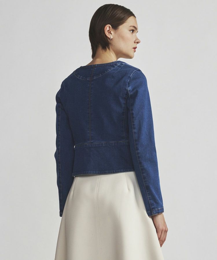 大きくVの字に空いた胸元と、存在感のあるセンタージップが印象的なデニムジャケット。世界トップシェアを誇るトルコのISKO(イスコ)社のデニムを使用し、独特の風合いが魅力的な表情を見せてくれます。短めの身頃が女性らしい洗練された印象を与え、スタイリッシュな大人カジュアルスタイルを完成させます。