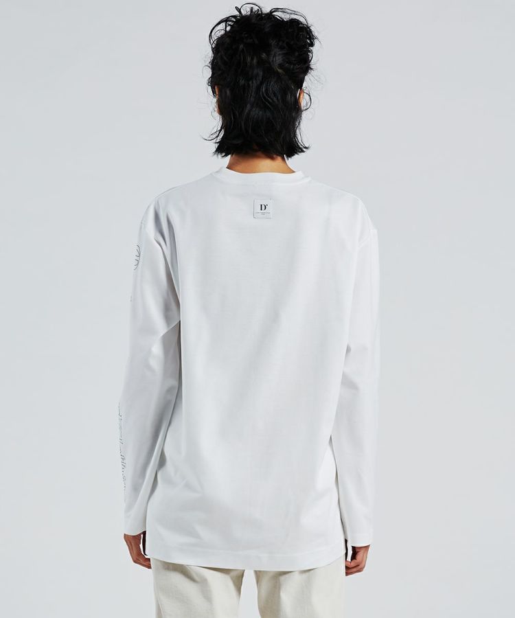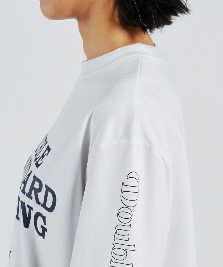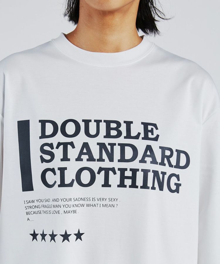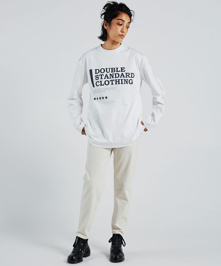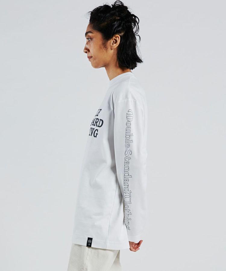 ダブスタのロゴを全面にあしらったロングスリーブTシャツ。袖にもロゴをあしらい、ストリートテイストをプラスしました。着こなし方に合わせてポイントになる、背中のタグや裾のエンブレムもうれしい。また、モノトーンなのでどんな着こなしにも合わせやすいです。一枚あると着こなしの幅が広がるアイテム。