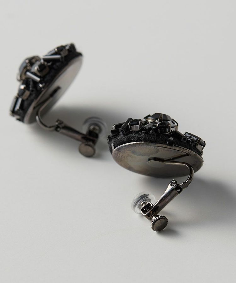 4種類の異なるサイズのラインストーン、ビーズが刺繍されたイヤリング。ヴィンテージ感があり、普段着からオケージョンまで、さまざまなシーンで着けられます。フェルトの上にビーズ、ラインストーンを一つずつ手作業で縫っていき、イヤリング台に包んで仕上げているため、とても精巧で手間のかかったアイテム。シックなブラックが凛とした表情を演出してくれます。