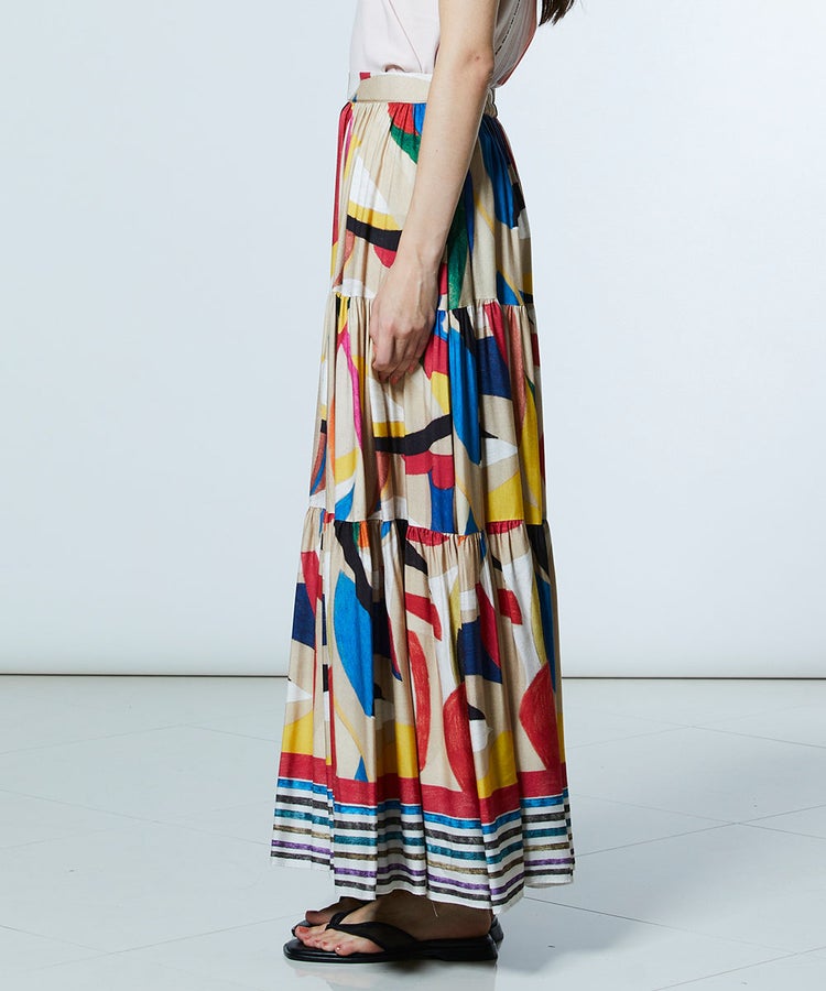 カラフルで存在感抜群のロングスカート。たっぷりと施したギャザーとティアード調のシルエットが動くたびに華やかさを演出します。とろみのある美しい落ち感とドレープ性、しなやかな肌触りに上品な光沢を備えたレーヨン素材を使用し、エレガントな雰囲気をプラス。同素材のシャツ(型番:0204490261)と合わせれば、統一感のある印象的なセットアップスタイルも楽しめます。