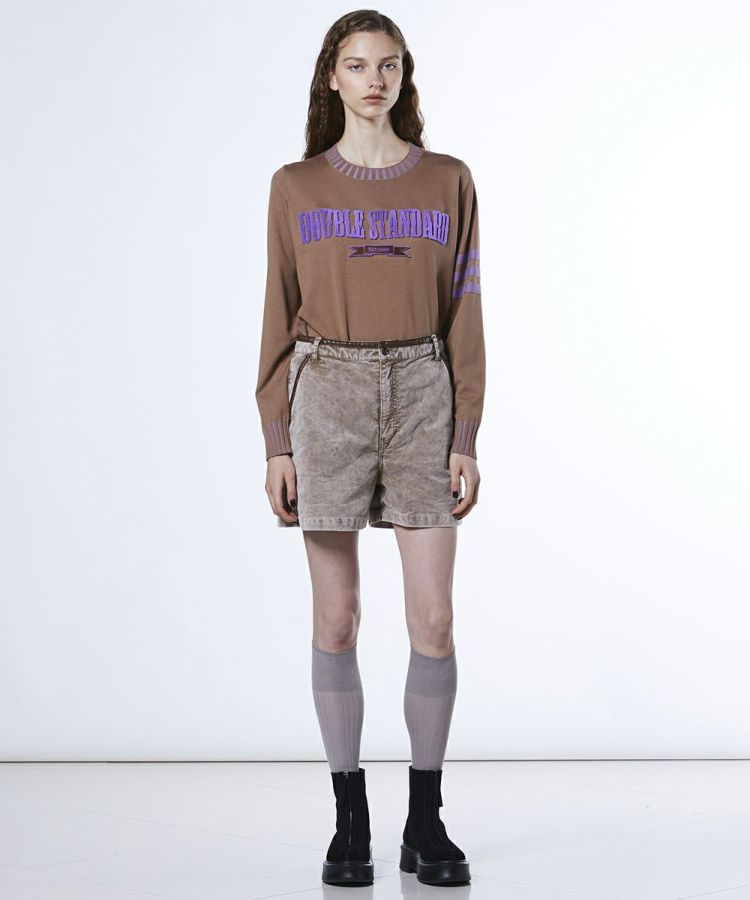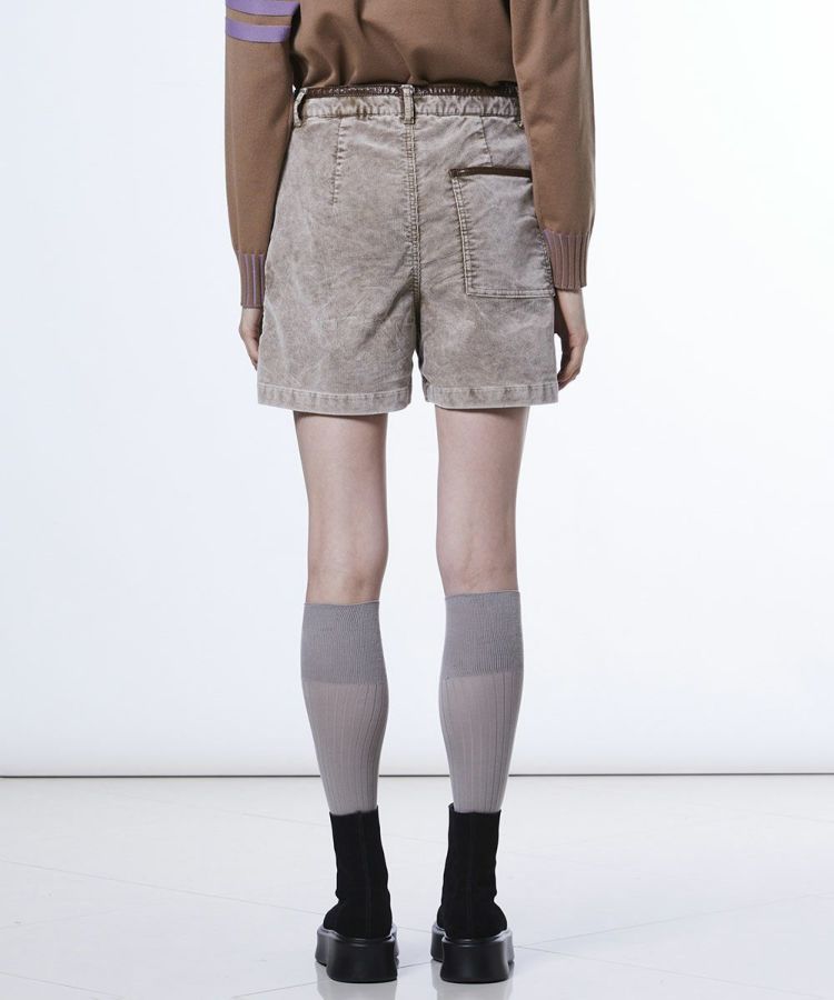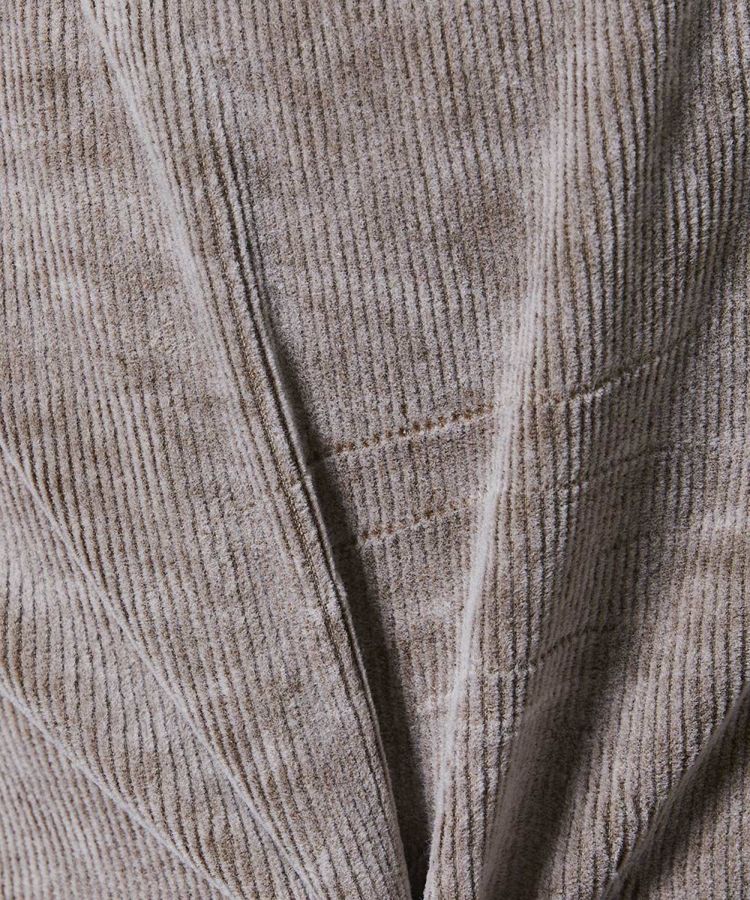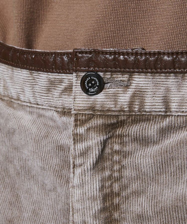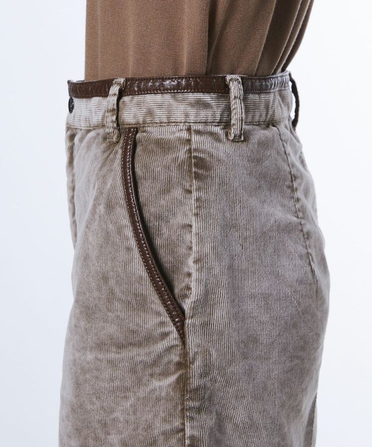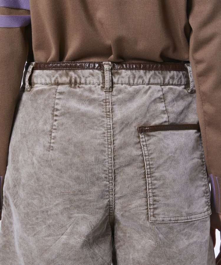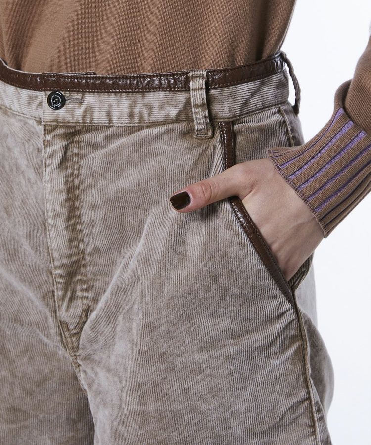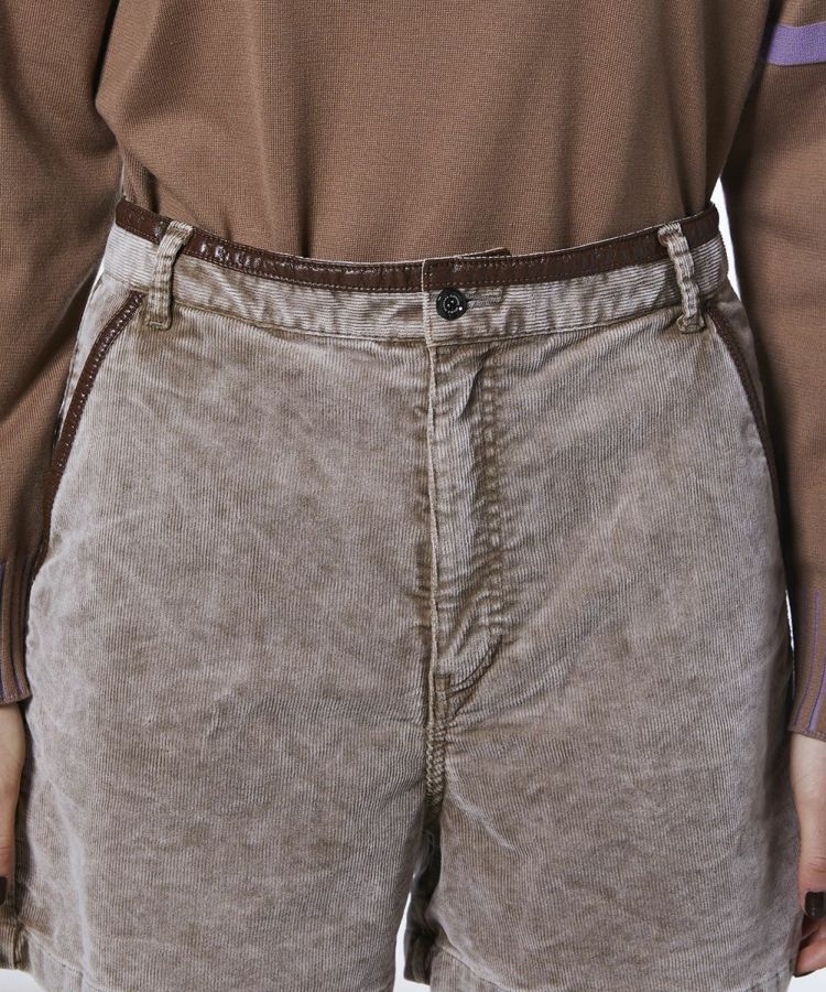 大人カジュアルな雰囲気のコーデュロイショートパンツ。ヴィンテージライクなムラ感がこなれた印象を与えつつ、カジュアルすぎない上品な表情に仕上げています。さりげなくあしらったレザーがデザインのアクセントとなり、装いに高級感をプラス。同素材のジャケット(型番:0205050254)とのセットアップスタイルなら、スタイリッシュなセットアップスタイルが完成します。
