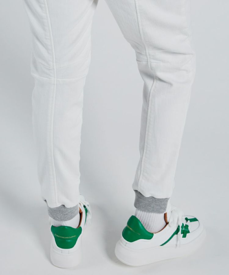 今季イチオシの、スポーツMIXスタイルにこなれ感を出してくれるホワイトデニムパンツ。ニットなのでストレッチ性があり楽チンで、素材感はしっかりジーンズながらもレギンス感覚で穿けるのが魅力です。太ももまわりをカバーしてくれる大きめポケットと、バッグの切り替えもポイント。白でも膨張せず美脚見えします。