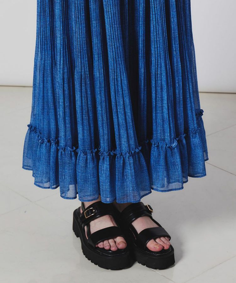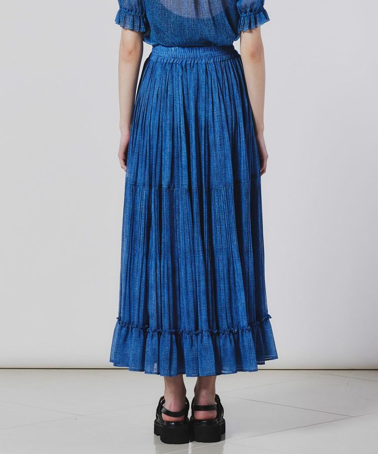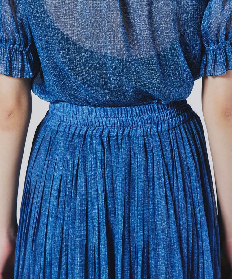 デニムプリントの鮮やかなブルーが目を惹くロングスカート。インパクトたっぷりなプリントと、たっぷりのギャザーのフェミニンなムードの組み合わせが絶妙です。歩くたびにさりげないシアー感が楽しめる裾のフリルもポイント。ウエストはゴム仕様なので履き心地は楽チンです。プリントとギャザーの縦ラインで、ヒップや腰のラインが自然にカバーされるのもうれしい。同素材のブラウス(型番:0504000243)と合わせてワンピースとして着こなすのもおすすめです。