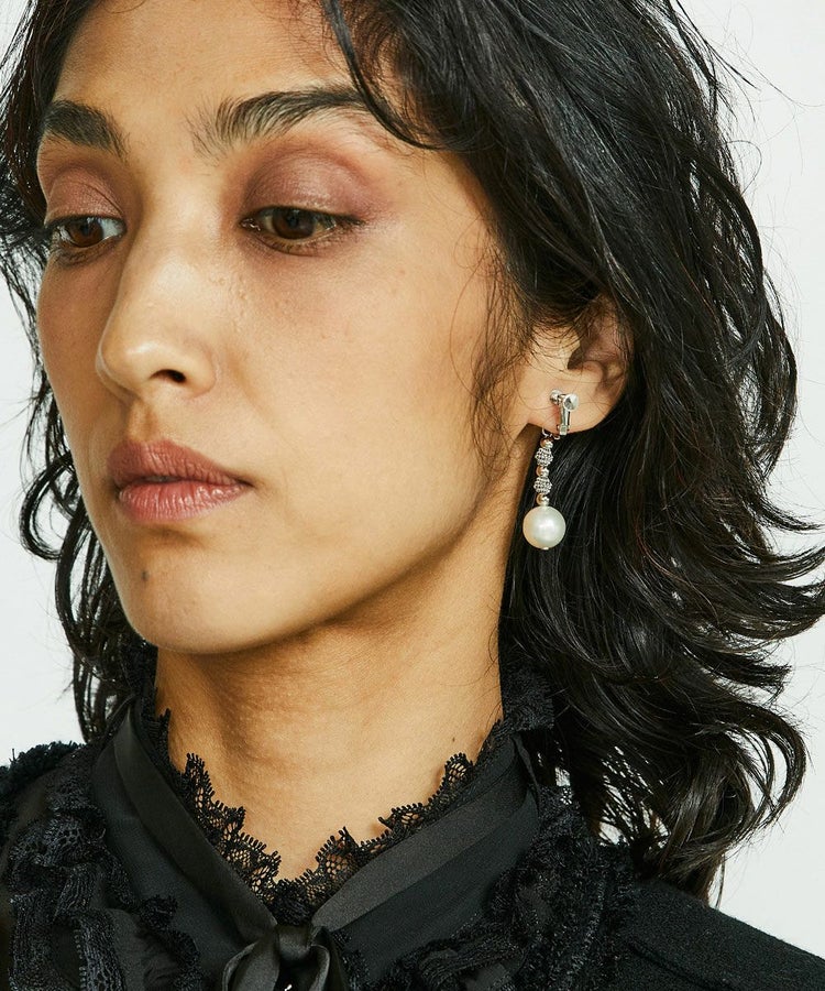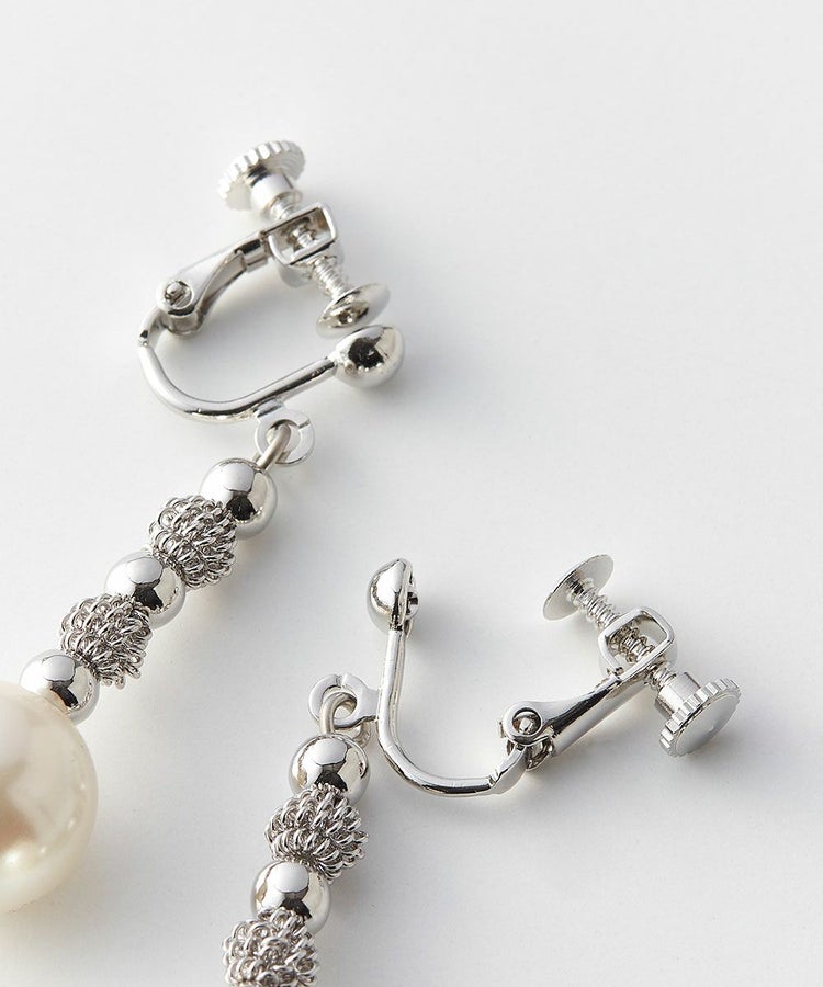 パールとシルバー・ゴールドのパーツを合わせた、シンプルで華やかなイヤリング。耳元でゆらゆらと揺れ、女性らしい印象を与えてくれます。シンプルながらも良く見ると複雑な作りもポイント。繊細な仕上がりのメタルパーツと胴玉の二種類を組み合わせることにより、パールを際立たせ華やかさを出しています。シンプルなコーディネートにプラスするだけで、上品な輝きが増すアイテム。メタルリングパールを使用したネックレスに合わせたデザインです。