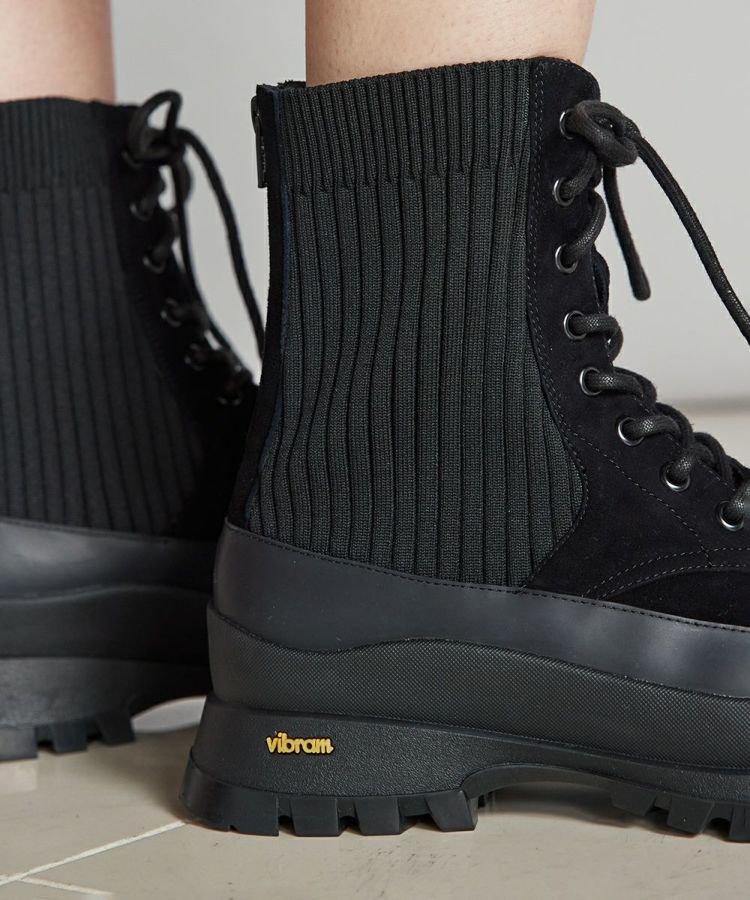 リブニットとスエードレザーを組み合わせたレースアップスニーカーブーツ。ビブラムソールなので履き心地抜群。少し厚さのあるソールでさりげない脚長効果も狙えるのがうれしいポイントです。バックジップ仕様で着脱も容易。ワンピースに合わせてはずしにするなど、メンズライクな足元を演出してくれる一足です。
