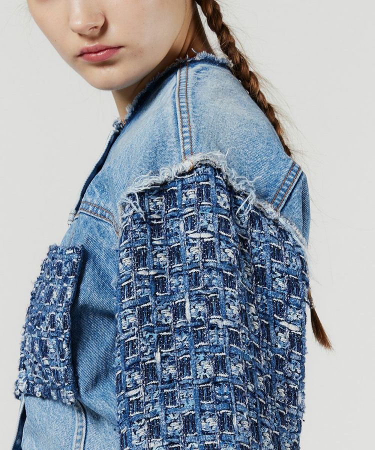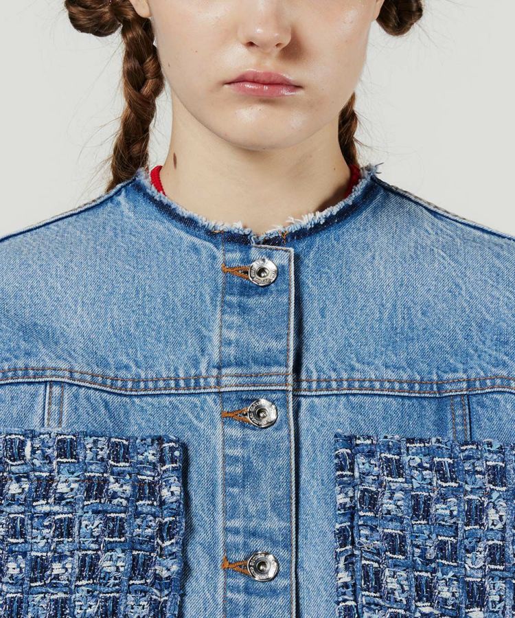 デニムで作ったツィード生地をドッキングした、唯一無二のデザインが光るジャケット。ジャパンクオリティのクラフト感が漂いながらも、ノーカラーのショート丈にすることでファッショナブルに仕上げました。また、デニムなのでどんなトップスにも合わせやすいのが魅力。デニムのコーデに合わせて、ワンランク上のデニム×デニムの着こなしを楽しむのもおすすめです。