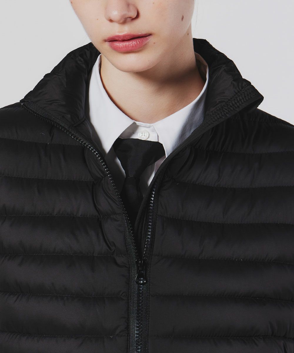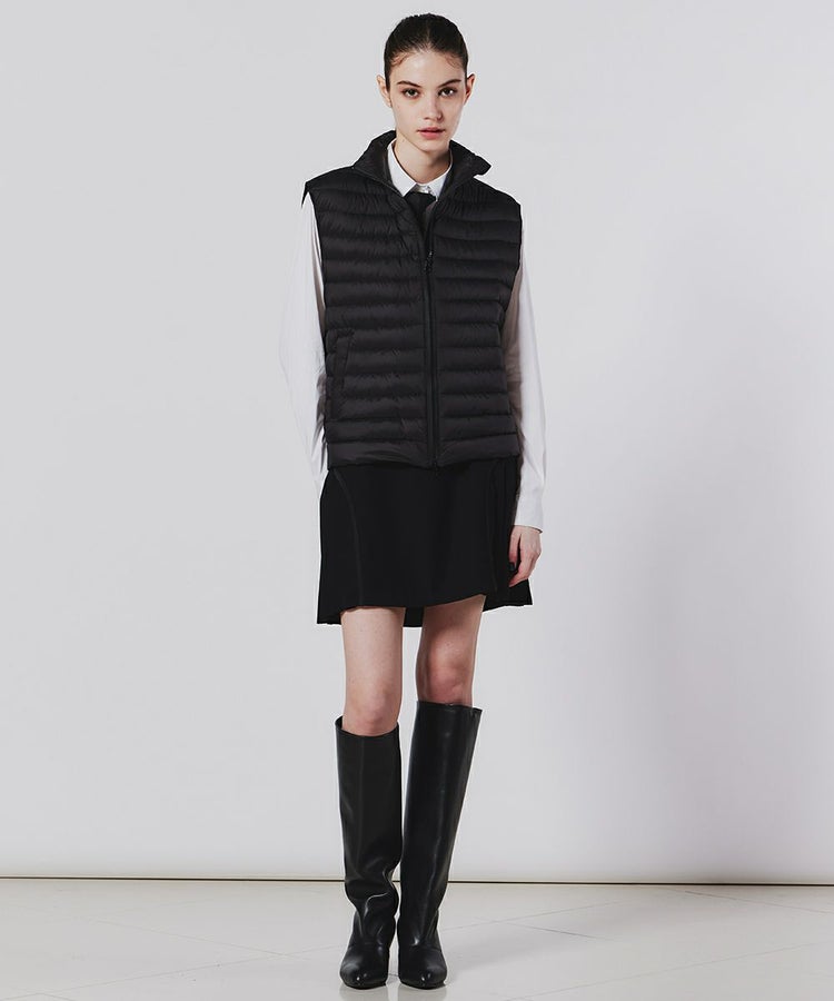タフタ素材とダンボール生地をドッキングしたキルティングベスト。ダウン90、フェザー10の羽毛を採用し、軽い着心地でもしっかりと暖かい一着に仕上げました。フードもなくすっきりとしたデザインで、アウターの中のレイヤードアイテムとしても重宝するのが魅力。心地良い柔らかさで、秋冬の大人カジュアルスタイルに活躍する優れものです。