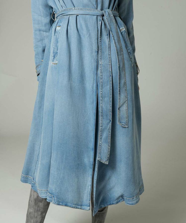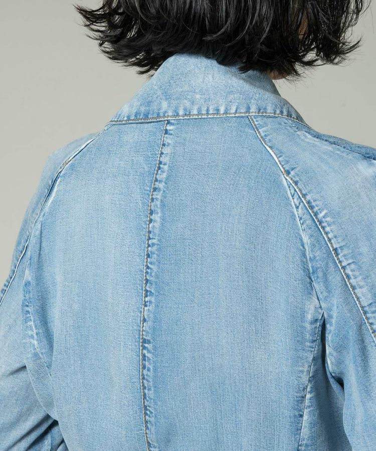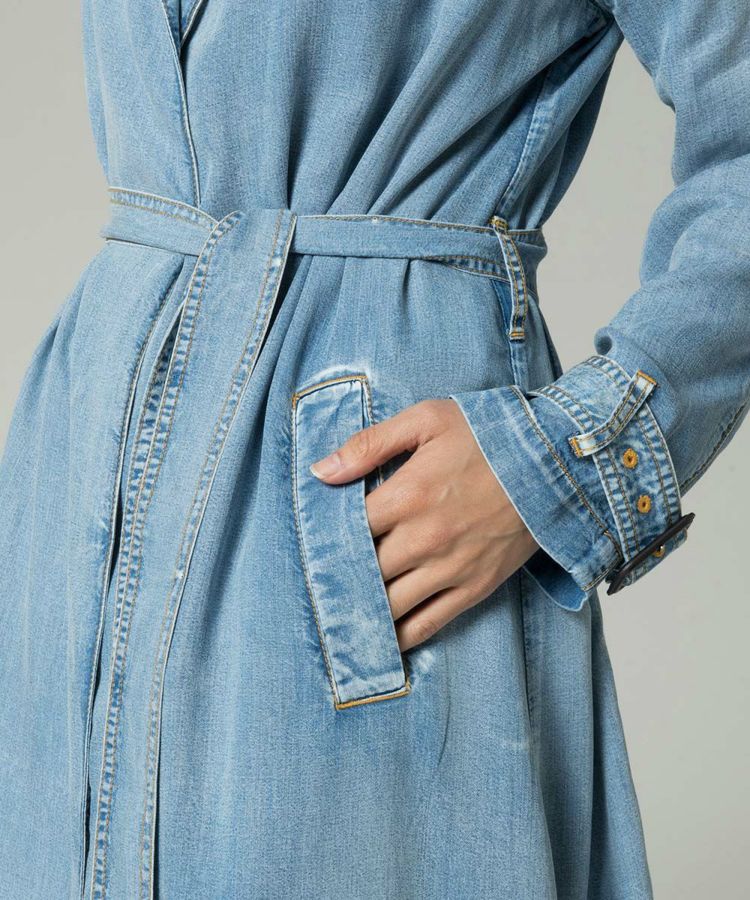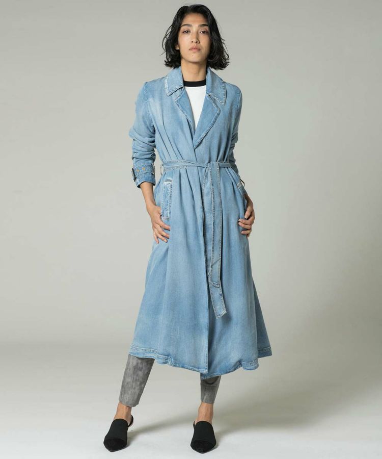 こなれ感抜群のガウンコート。テンセルデニムならではの柔らかな表情と、ヴィンテージ感のあるカラーが魅力。装いを引き締めるベルト使いもこだわりのデザインアクセント。もちろん着心地はソフトでしなやか。大人にふさわしいリラックス感も演出します。シンプルな白Tシャツとスキニーパンツの上に重ねて、春らしい装いを楽しんで。