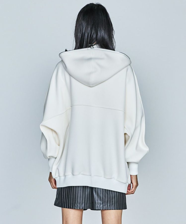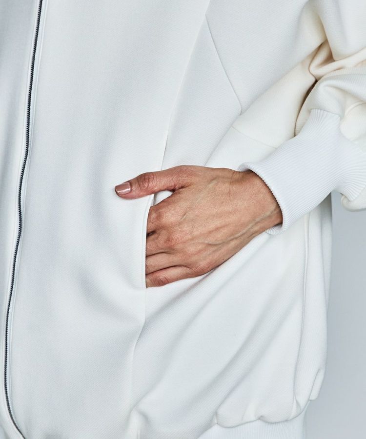 柔らかく滑らかな表面で、カジュアルながらも品のある印象のビッグシルエットパーカー。ダンボール素材にベア糸を混ぜ込み、より膨らみを出した素材を使用しています。また、ジャガード編みの綾目組織の素材を使用することで目面に高級感をプラス。ボリュームをたっぷり出しているので、襟まわりに立体感が出るのが魅力です。手首はリブ使いでしっかり引き締め、女性らしいメリハリのあるシルエットにしているのもポイント。