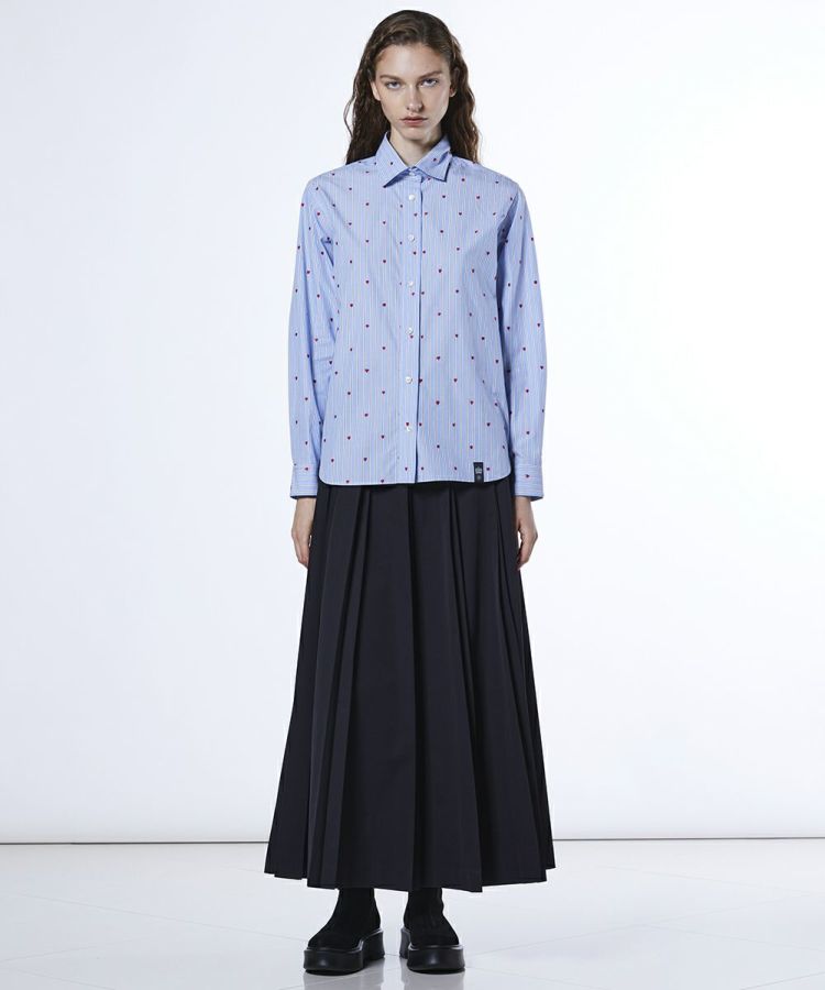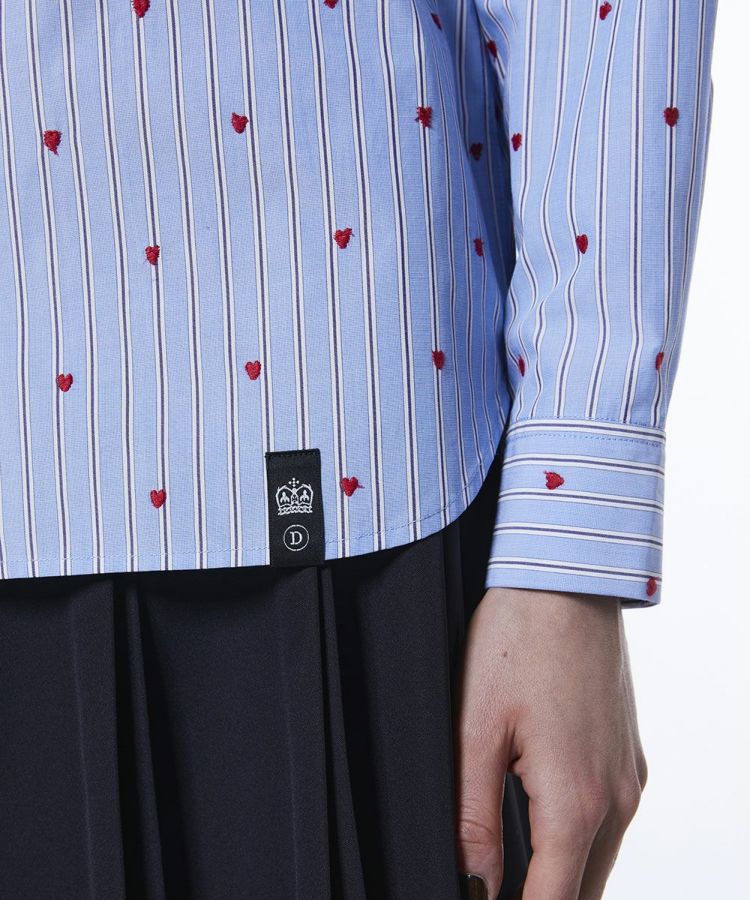 全面にハートの刺繍を散りばめたキュートなシャツ。先染めストライプ生地を使用することで、可愛くなりすぎず大人っぽく仕上げました。やや長めの丈感で腰まわりをカバーできるのも嬉しいポイント。1枚でさらりと着るのはもちろん、カーディガンやニットとのレイヤードにも活躍する一枚です。