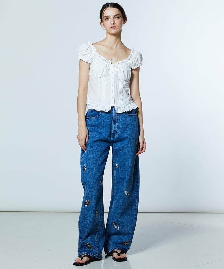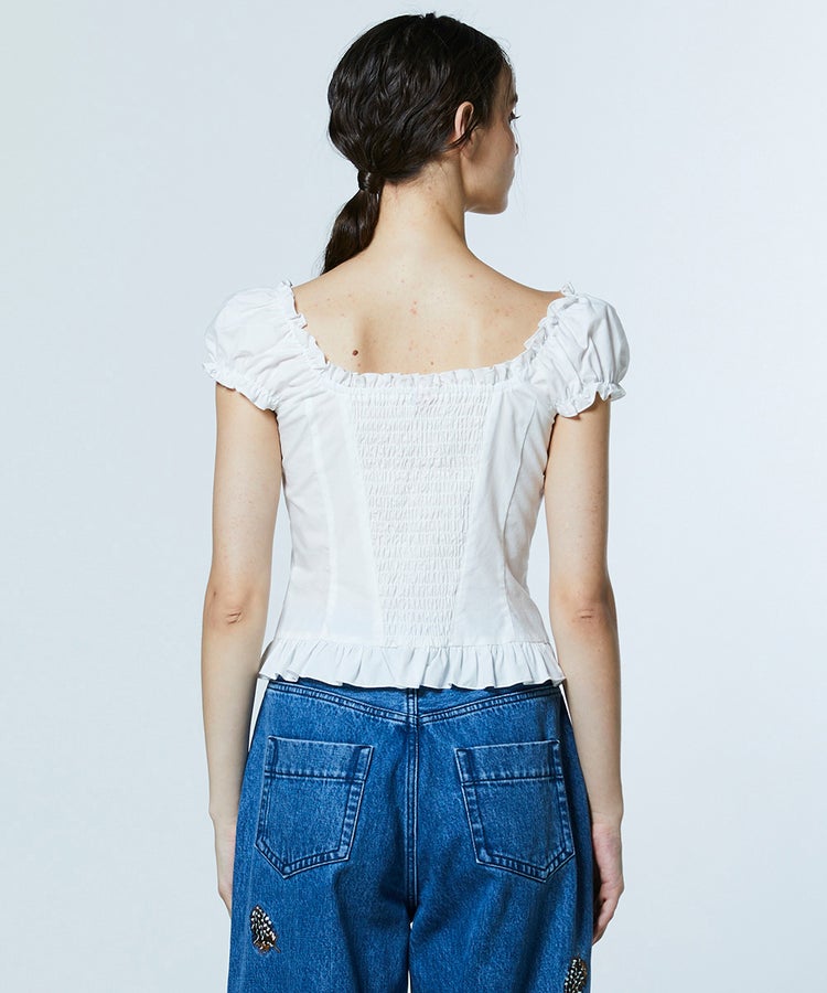 フェミニンな雰囲気漂うトップス。胸元や背中を大胆に開けたデザインで、デコルテラインを美しく引き立て、女性らしさを演出しました。首元や袖口、裾にはフリルをあしらい、ロマンティックなエッセンスをプラス。デニムやカーゴパンツと合わせたカジュアルな着こなしはもちろん、ショートスカートと合わせたガーリーなスタイルもおすすめです。