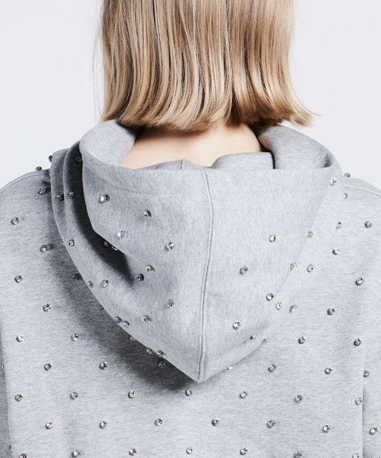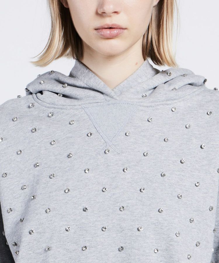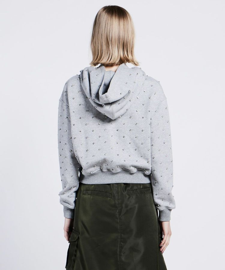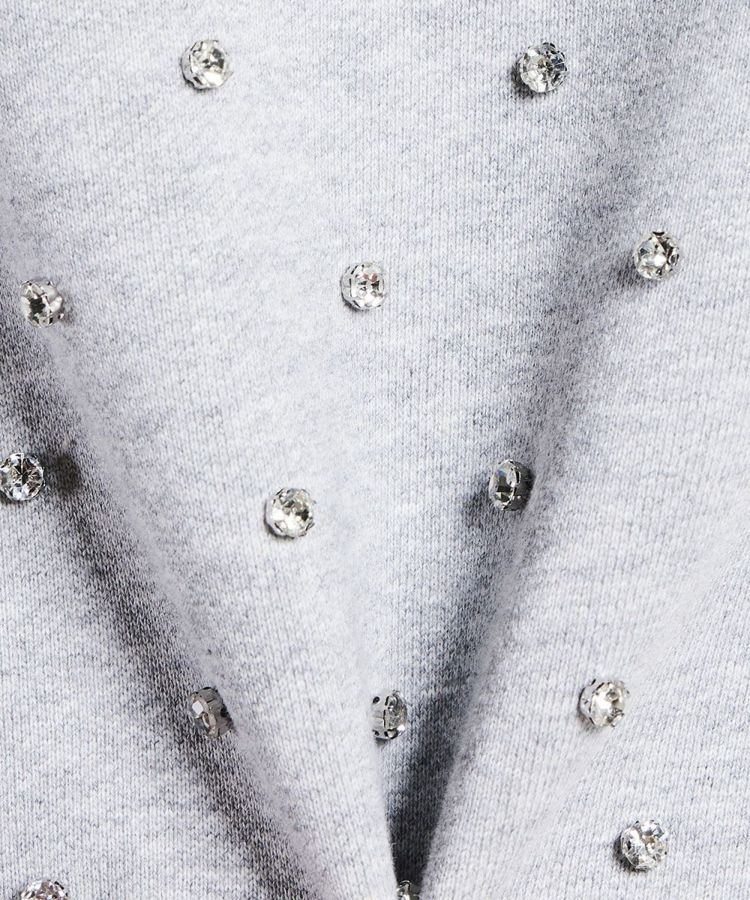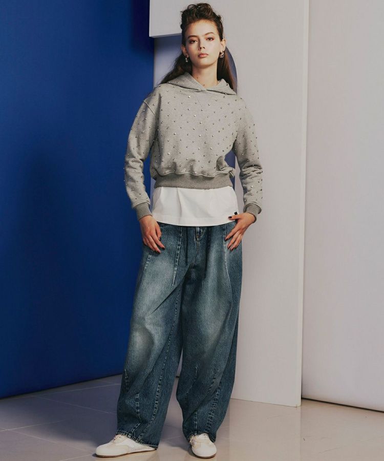 コーディネート力に優れたミニ丈の裏毛パーカー。ラインストーンを全面にあしらい、華やかさをプラスしました。ミニ丈ながらもゆったりとしたシルエットで、これ一枚でトレンド感を出せるアイテム。全身のバランスを取りやすく、スタイルアップ効果があるのもうれしいポイントです。スカートやボリュームのあるボトムとの相性は抜群!