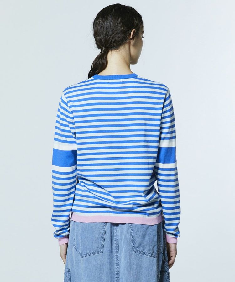 鮮やかなブルーとホワイトのボーダー柄が爽やかな印象を与えるニット。胸元にはブランド頭文字の「D」をローブ刺繍で立体的にあしらい、さりげない存在感をプラスしました。裾に施したピンクのラインが、キュートなアクセントに。デニムと合わせたカジュアルスタイルはもちろん、ロングスカートと合わせたフェミニンな着こなしも楽しめる一枚です。
