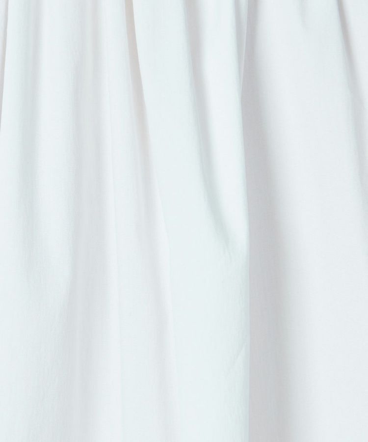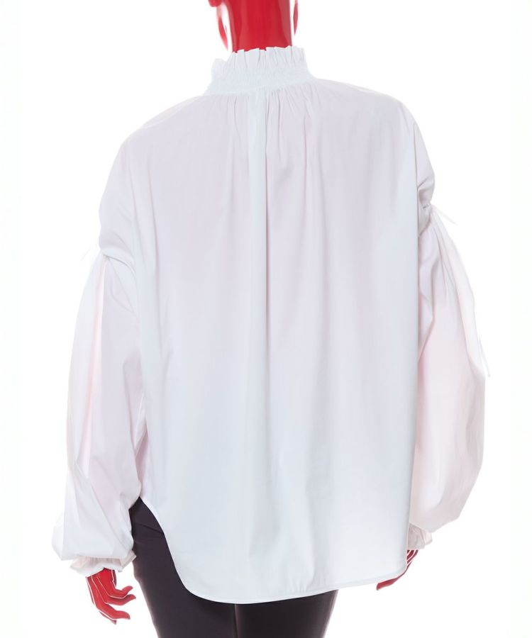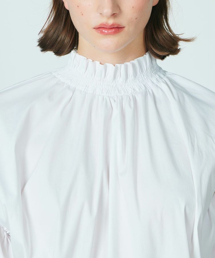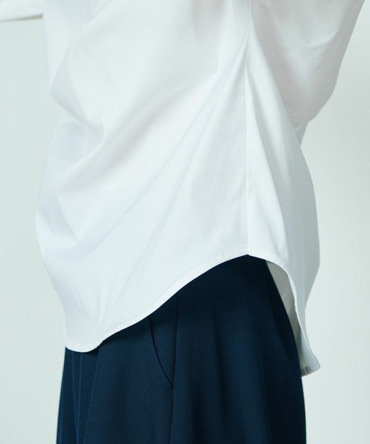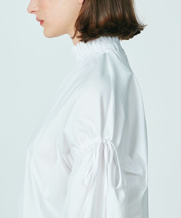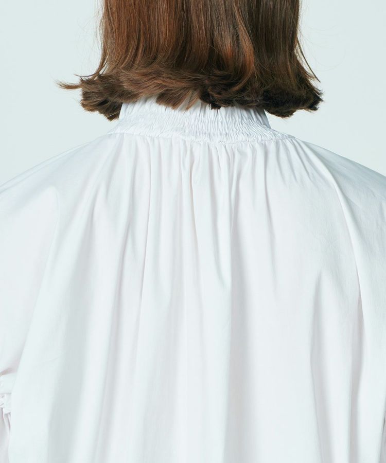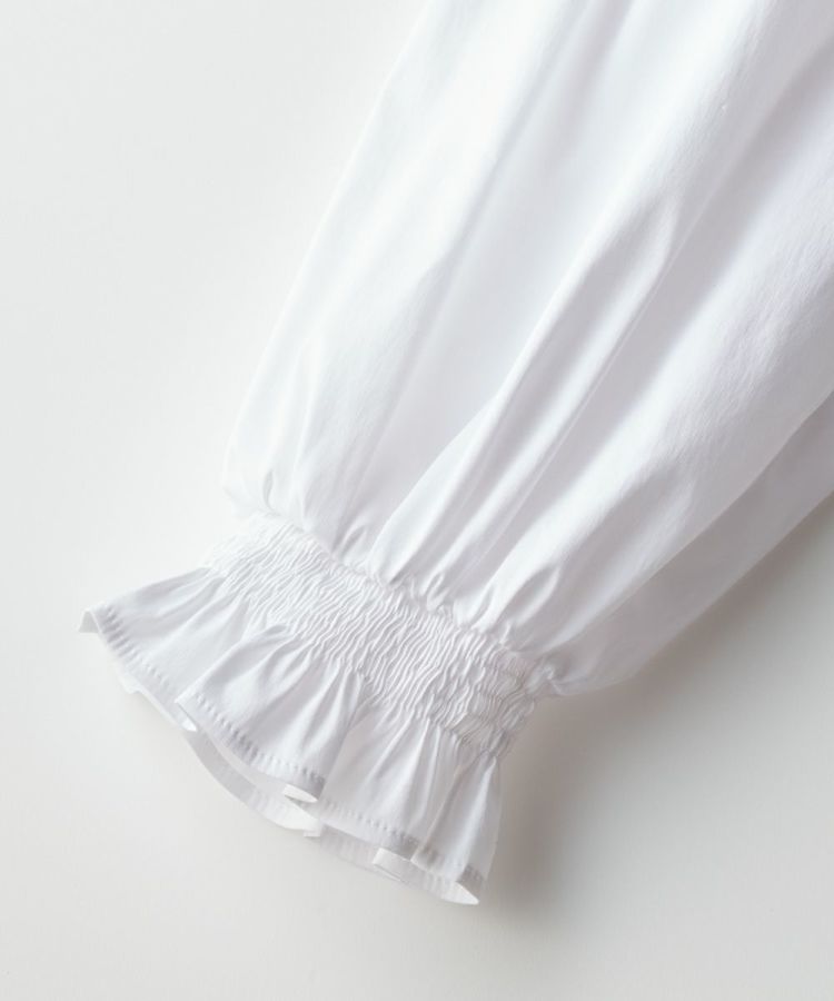 パリッとした質感がかっこいいブラウス。ゆったりとしたシルエットでマニッシュな雰囲気ながら、襟元がフリルになり、ほんのりと華やかさがあります。また、ショルダーは落とし気味に作り、ギャザーを寄せてシルエットにメリハリをプラス。リボンもさりげないフェミニンさを出し、コーディネートした時に全身にモード感が出るのが密かなポイントです。爽やで合わせやすいホワイト。